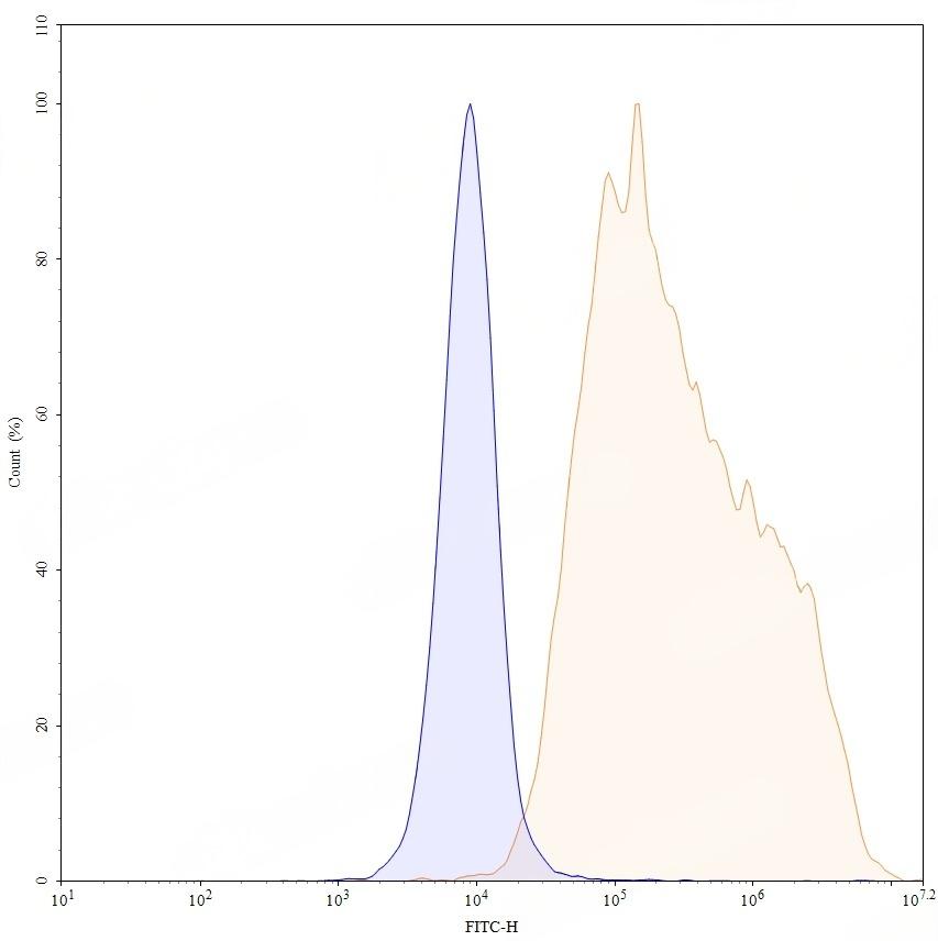 Flow-cytometry using anti-human CD183 antibody. Untransfected cells (blue Histogram) and Transfected cells (Yellow Histogram) were stained with an anti-human CD183 monoclonal antibody (Catalog: TD-HW606107) at a concentration of 5 µg/ml for 30 mins at RT. After washing, bound antibody was detected using a Goat Anti-Mouse IgG H&L Polyclonal Antibody, FITC (abinScience: TD-MF690414) and cells analysed on a NovoCyte Flow Cytometer.