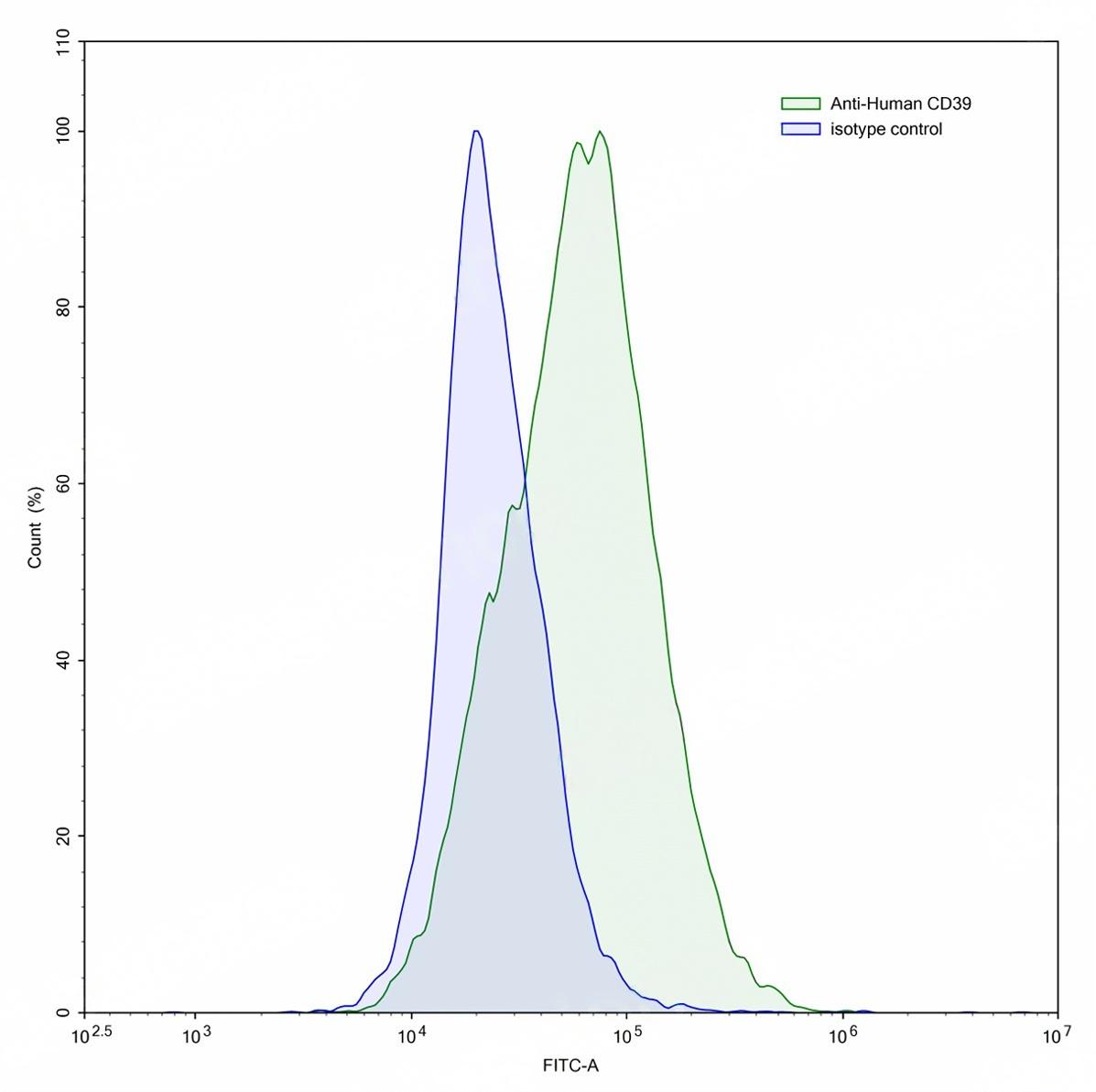Flow-cytometry using anti-human CD39 antibody.CD39 Transfected CHO cells were stained with an irrelevant antibody (Blue Histogram) or an anti-human CD39 antibody monoclonal antibody (Catalog # TD-HW564107 ,Green Histogram) at a concentration of 5 µg/ml for 30 mins at RT. After washing, bound antibody was detected using a FITC conjugated goat anti-mouse antibody (Catalog # TD-MF690414) and cells analysed on a NovoCyte Flow Cytometer.