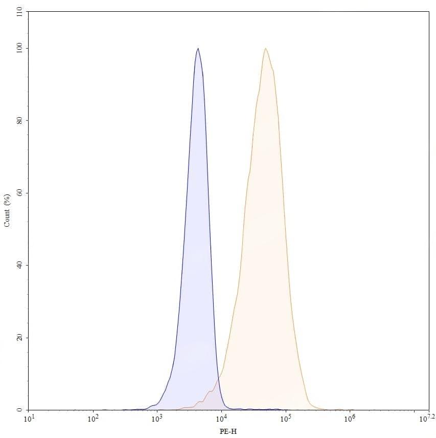 Flow-cytometry using PE anti-human CD146 antibody. Hela cells were stained with an irrelevant antibody (Blue Histogram) or an PE anti-human CD146 monoclonal antibody (Catalog No.:TD-HW484227, Yellow Histogram) at a concentration of 5 µg/ml for 30 mins at RT. After washing, and cells analysed on a NovoCyte Flow Cytometer.