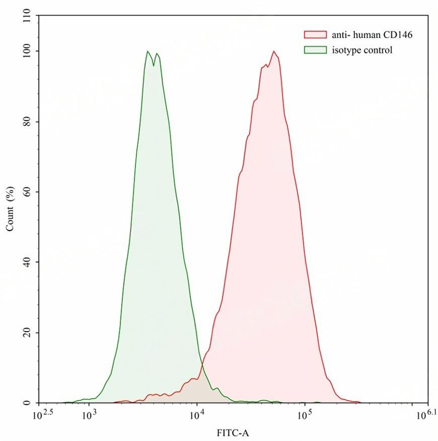 Flow-cytometry using anti-human CD146 antibody. Human HeLa cell line were stained with an irrelevant antibody (Green Histogram) or an anti-human CD146 antibody monoclonal antibody (Catalog # TD-HW484207 , Red Histogram) at a concentration of 5 µg/ml for 30 mins at RT. After washing, bound antibody was detected using a FITC conjugated goat anti-human antibody (Catalog # TYD-HF690414) and cells analysed on a NovoCyte Flow Cytometer.