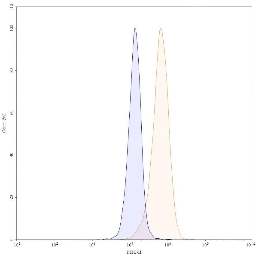 Flow-cytometry using FITC anti-human CD146 antibody. Hela cells were stained with an irrelevant antibody (Blue Histogram) or an FITC anti-human CD146 monoclonal antibody (Catalog No.:TD-HW484117, Yellow Histogram) at a concentration of 5 µg/ml for 30 mins at RT. After washing, and cells analysed on a NovoCyte Flow Cytometer.