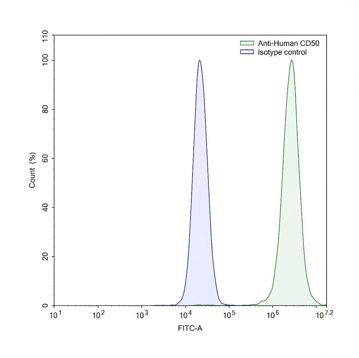 Detects Human CD50/ICAM3 in indirect ELISAs. | Flow-cytometry using anti-human CD50 antibody.RPMI-8226 cells were stained with an irrelevant antibody (Blue Histogram) or an anti-human CD50 antibody monoclonal antibody (Catalog No.:TD-HW443107 ,Green Histogram) at a concentration of 5 µg/ml for 30 mins at RT. After washing, bound antibody was detected using a FITC conjugated goat anti-mouse antibody (Catalog No.:TD-MF690414) and cells analysed on a NovoCyte Flow Cytometer. | Flow-cytometry using anti-human CD50 antibody.Human peripheral blood lymphocytes were stained with an irrelevant antibody (Blue Histogram) or an anti-human CD50 antibody monoclonal antibody (Catalog No.:TD-HW443107 ,Green Histogram) at a concentration of 5 µg/ml for 30 mins at RT. After washing, bound antibody was detected using a FITC conjugated goat anti-mouse antibody (Catalog No.:TD-MF690414) and cells analysed on a NovoCyte Flow Cytometer.