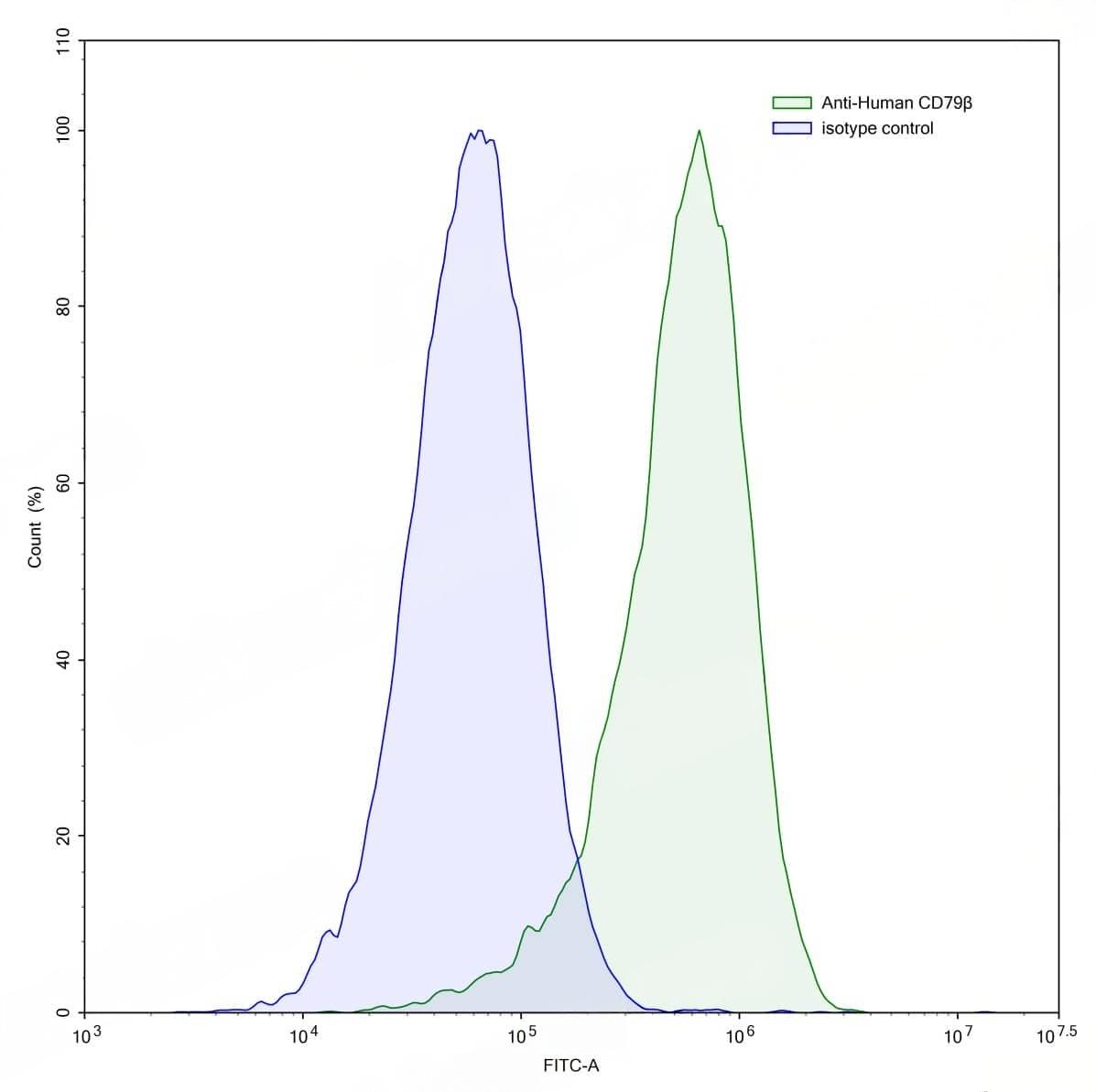 Detects CD79β/CD79B in indirect ELISAs. | Flow-cytometry using anti-human CD79β antibody.Daudi cells were stained with an irrelevant antibody (Blue Histogram) or an anti-human CD79β antibody monoclonal antibody (Catalog No.:TD-HW431207 ,Green Histogram) at a concentration of 5 µg/ml for 30 mins at RT. After washing, bound antibody was detected using a FITC conjugated goat anti-mouse antibody (Catalog No.:TD-MF690414) and cells analysed on a NovoCyte Flow Cytometer. | Flow-cytometry using anti-human CD79β antibody.Human peripheral blood lymphocytes were stained with an irrelevant antibody (Blue Histogram) or an anti-human CD79β antibody monoclonal antibody (Catalog No.:TD-HW431207 ,Green Histogram) at a concentration of 5 µg/ml for 30 mins at RT. After washing, bound antibody was detected using a FITC conjugated goat anti-mouse antibody (Catalog No.:TD-MF690414) and cells analysed on a NovoCyte Flow Cytometer.