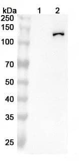 SDS-PAGE for Anti-Human NOS2/iNOS Antibody (SAA0105) | Western blot analysis was performed using anti-INOS monoclonal antibody at 1ug/mL on various samples.Lane 1:RAW264.7 cell lystaeLane 2:RAW264.7+LPS cell lystae