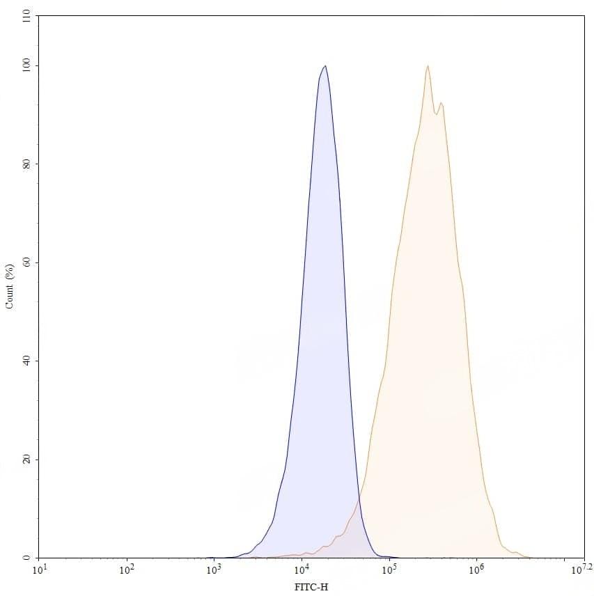 Flow-cytometry using anti-human CD196 antibody. Untransfected cells (blue Histogram) and Transfected cells (Yellow Histogram) were stained with an anti-human CD196 monoclonal antibody (Catalog No.:TD-HW383107) at a concentration of 5 µg/ml for 30 mins at RT. After washing, bound antibody was detected using a Goat Anti-Mouse IgG H&L Polyclonal Antibody, FITC (Catalog No.:TD-MF690414) and cells analysed on a NovoCyte Flow Cytometer.