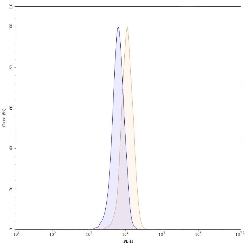 Flow-cytometry using PE anti-human CD309 antibody. HUVEC cells were fixed and permeabilized, then stained with an irrelevant antibody (Blue Histogram) or an PE anti-human CD309 monoclonal antibody (Catalog No.:TD-HW338127, Yellow Histogram) at a concentration of 5 µg/ml for 30 mins at RT. After washing, cells analysed on a NovoCyte Flow Cytometer.