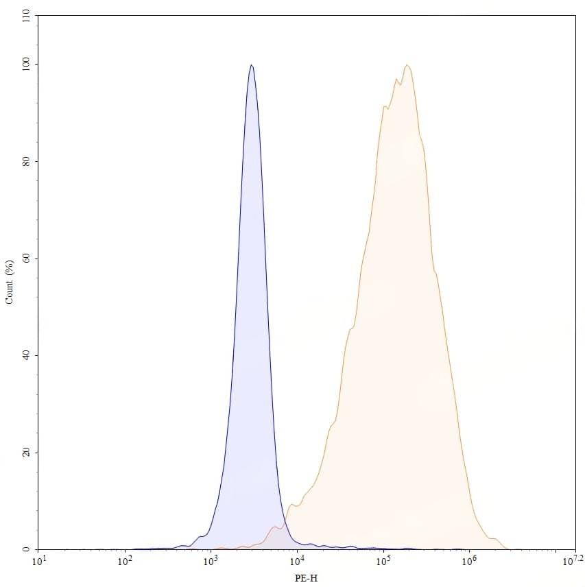 Flow-cytometry PE using anti-human CD114 antibody. Untransfected cells (blue Histogram) and Transfected cells (Yellow Histogram) were stained with an PE anti-human CD114 monoclonal antibody (Catalog No.:TD-HV643127) at a concentration of 5 µg/ml for 30 mins at RT. After washing, cells analysed on a NovoCyte Flow Cytometer.