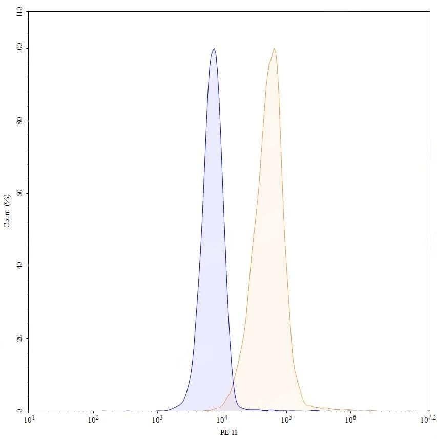 Flow-cytometry using PE anti-human CD276 antibody. PC-3 cells were stained with an irrelevant antibody (Blue Histogram) or an PE anti-human CD276 monoclonal antibody (Catalog No.:TD-HV612227, Yellow Histogram) at a concentration of 5 µg/ml for 30 mins at RT. After washing, cells analysed on a NovoCyte Flow Cytometer.