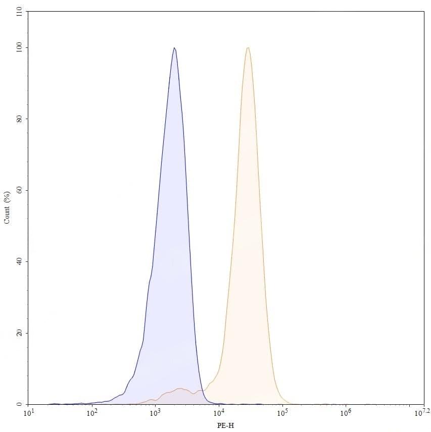 Flow-cytometry using PE anti-human CD100 antibody. Jurkat cells were stained with an irrelevant antibody (Blue Histogram) or an PE anti-human CD100 monoclonal antibody (Catalog No.:TD-HV563227, Yellow Histogram) at a concentration of 5 µg/ml for 30 mins at RT. After washing, and cells analysed on a NovoCyte Flow Cytometer.