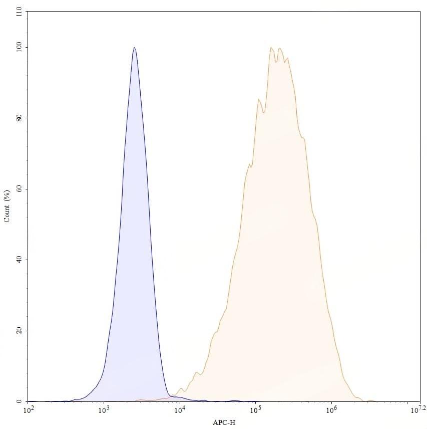 Flow-cytometry APC using anti-human CD350 antibody. Untransfected cells (blue Histogram) and Transfected cells (Yellow Histogram) were stained with an APC anti-human CD350 monoclonal antibody (Catalog No.:TD-HV512137) at a concentration of 5 µg/ml for 30 mins at RT. After washing, cells analysed on a NovoCyte Flow Cytometer.