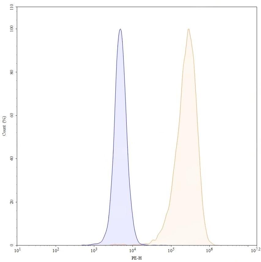 Flow-cytometry PE using anti-human CD371 antibody. Untransfected cells (blue Histogram) and Transfected cells (Yellow Histogram) were stained with an PE anti-human CD371 monoclonal antibody (Catalog No.:TD-HV493127) at a concentration of 5 µg/ml for 30 mins at RT. After washing, cells analysed on a NovoCyte Flow Cytometer.