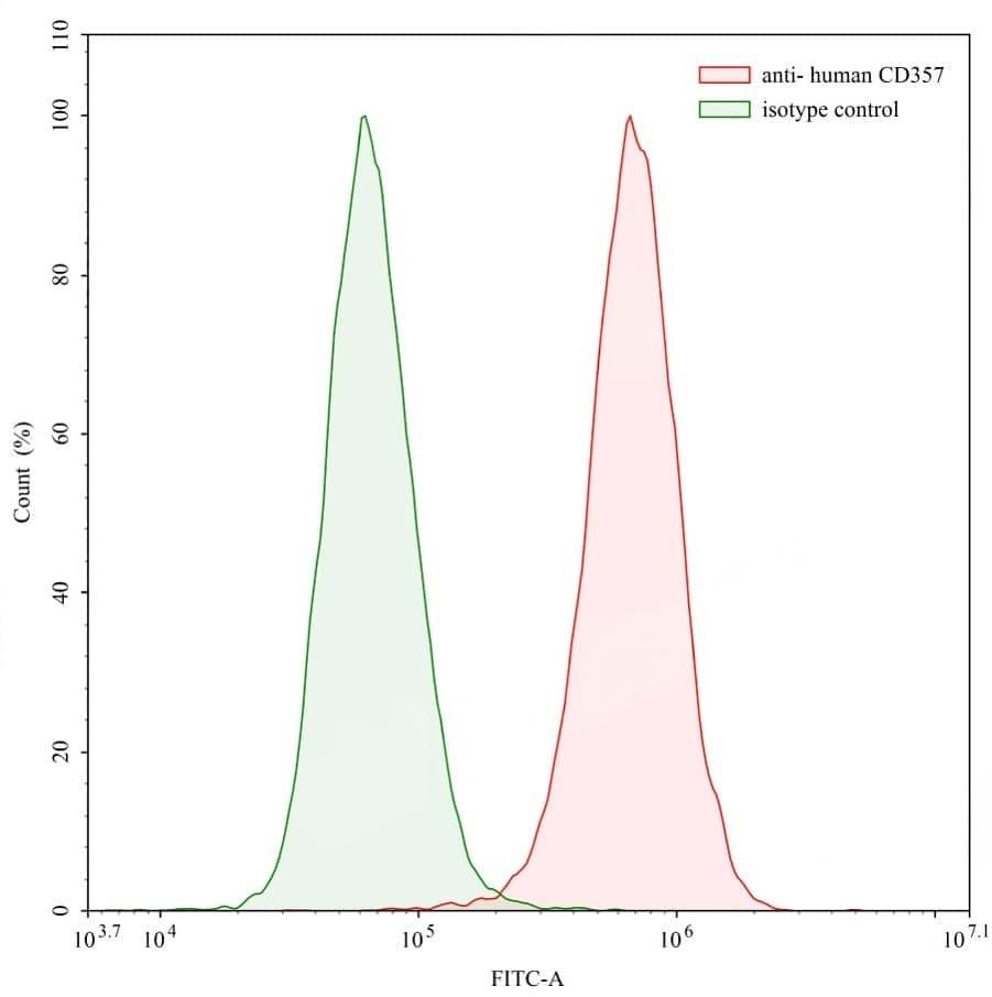 SEC-HPLC detection for Anti-Human CD357/TNFRSF18/GITR Antibody (hu6C8). | Flow-cytometry using anti-human CD357 antibody. Human RPMI-8226 cell line were stained with an irrelevant antibody (Green Histogram) or an anti-human CD357 antibody monoclonal antibody (Catalog No.:TD-HV475207 , Red Histogram) at a concentration of 20 µg/ml for 30 mins at RT. After washing, bound antibody was detected using a FITC conjugated goat anti-human antibody (Catalog No.:TD-HF690414) and cells analysed on a NovoCyte Flow Cytometer.