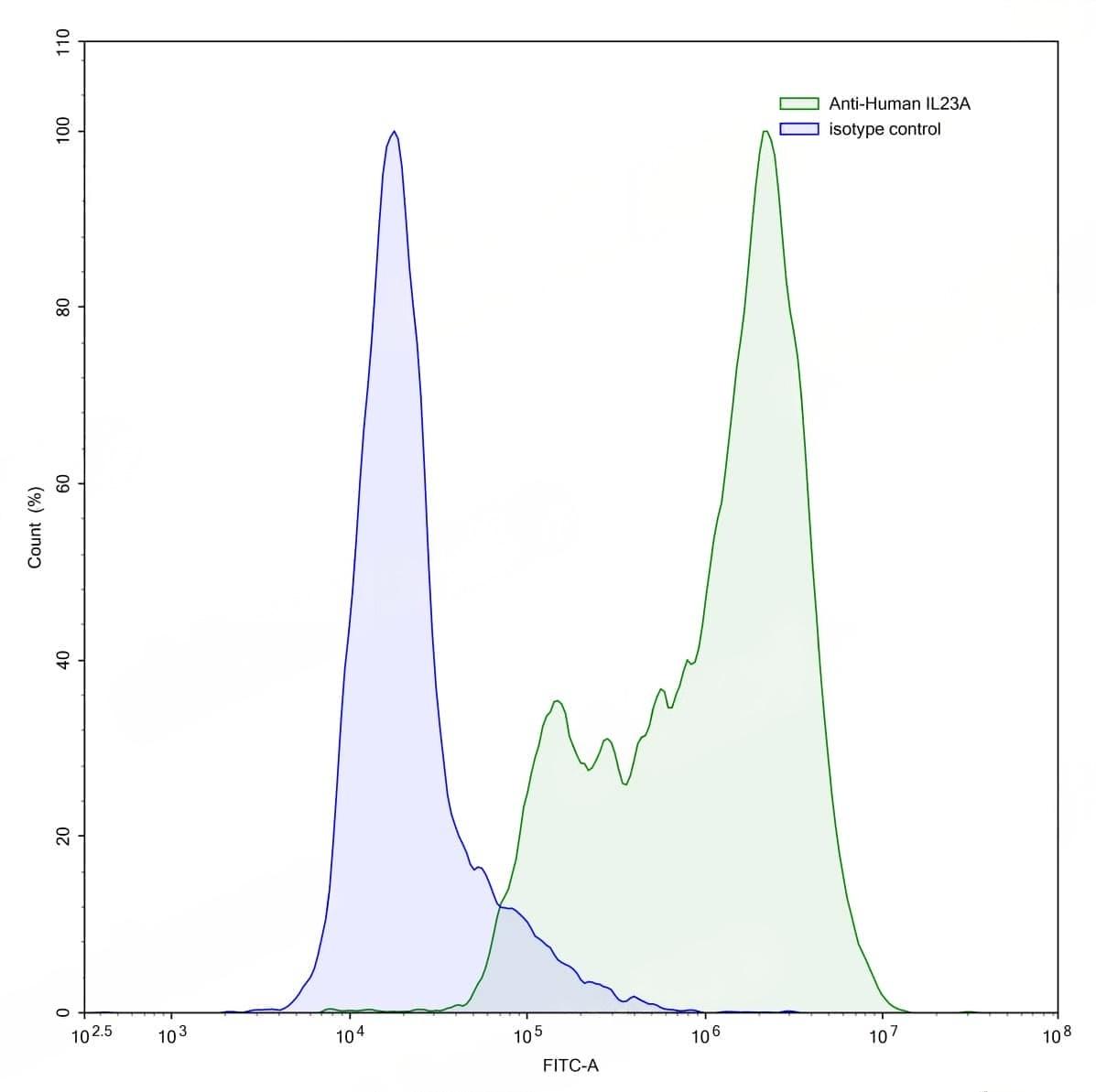 SEC-HPLC detection for Anti-Human IL23A Antibody (ABS0131). | Flow-cytometry using anti-human IL23A antibody.IL23A Transfected CHO cells were stained with an irrelevant antibody (Blue Histogram) or an anti-human IL23A antibody monoclonal antibody (Catalog No.:TD-HV466207 ,Green Histogram) at a concentration of 5 µg/ml for 30 mins at RT. After washing, bound antibody was detected using a FITC conjugated goat anti-human antibody (Catalog No.:TD-HF690414) and cells analysed on a NovoCyte Flow Cytometer. | Western blot analysis was performed using anti-IL23A monoclonal antibody at 1ug/mL on various samples.Lane 1:recombinant human IL23A (Catalog No.:TD-HV466011)Lane 2:negative control