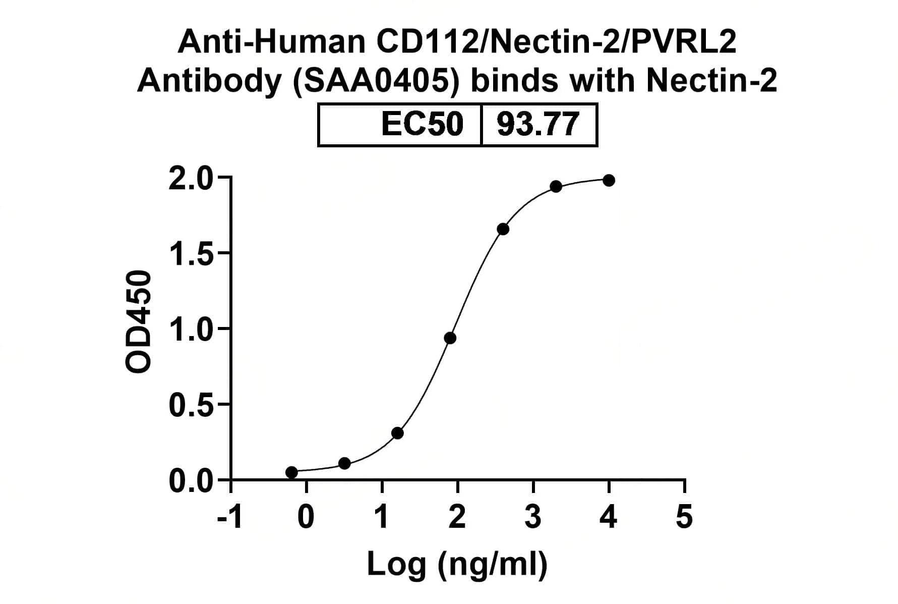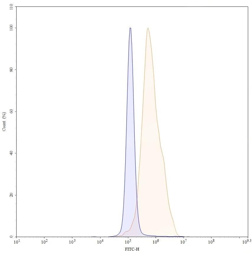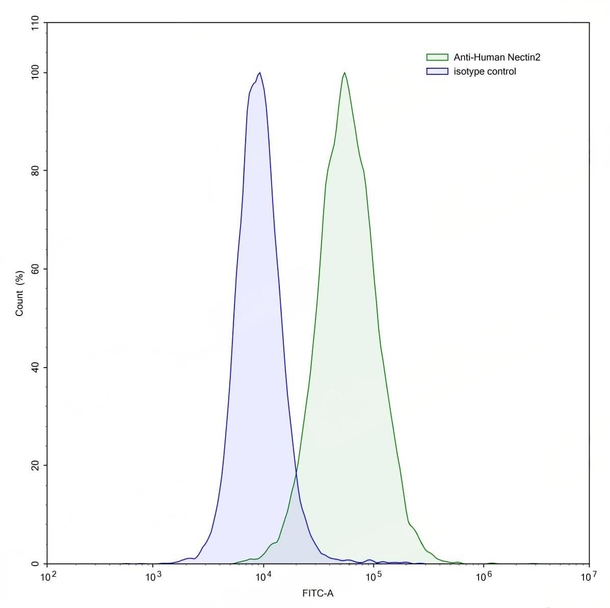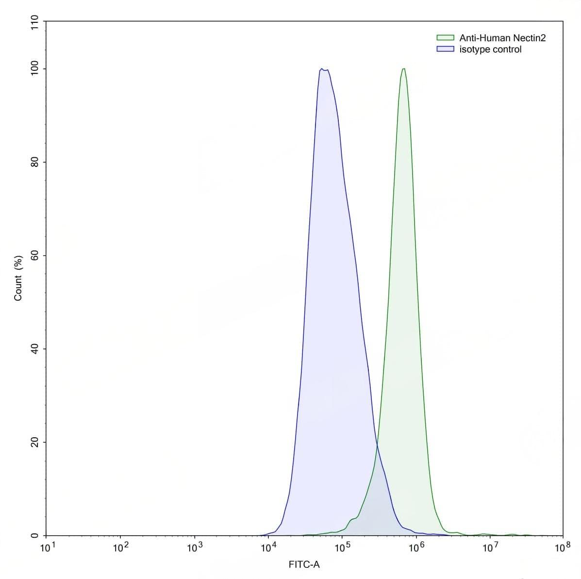 Detects CD112/Nectin-2/PVRL2 in indirect ELISAs. | Flow-cytometry using anti-human Nectin2 antibody.K562 cells were stained with an irrelevant antibody (Blue Histogram) or an anti-human Nectin2 antibody monoclonal antibody (Catalog No.:TD-HV456107 ,Green Histogram) at a concentration of 5 µg/ml for 30 mins at RT. After washing, bound antibody was detected using a FITC conjugated goat anti-mouse antibody (Catalog No.:TD-MF690414) and cells analysed on a NovoCyte Flow Cytometer. | Flow-cytometry using anti-human Nectin2 antibody.KG-1 cells were stained with an irrelevant antibody (Blue Histogram) or an anti-human Nectin2 antibody monoclonal antibody (Catalog No.:TD-HV456107 ,Green Histogram) at a concentration of 5 µg/ml for 30 mins at RT. After washing, bound antibody was detected using a FITC conjugated goat anti-mouse antibody (Catalog No.:TD-MF690414) and cells analysed on a NovoCyte Flow Cytometer. | Flow-cytometry using anti-human CD112 antibody. Untransfected cells (blue Histogram) and Transfected cells (Yellow Histogram) were stained with an anti-human CD112 monoclonal antibody (Catalog No.:TD-HV456107) at a concentration of 5 µg/ml for 30 mins at RT. After washing, bound antibody was detected using a Goat Anti-Mouse IgG H&L Polyclonal Antibody, FITC (Catalog No.:TD-MF690414) and cells analysed on a NovoCyte Flow Cytometer. | Western blot analysis was performed using anti-CD112/Nectin-2/PVRL2 monoclonal antibody at 1ug/mL on various samples.Lane 1:recombinant human CD112/Nectin-2/PVRL2 (Catalog No.:TD-HV456011)Lane 2:negative control