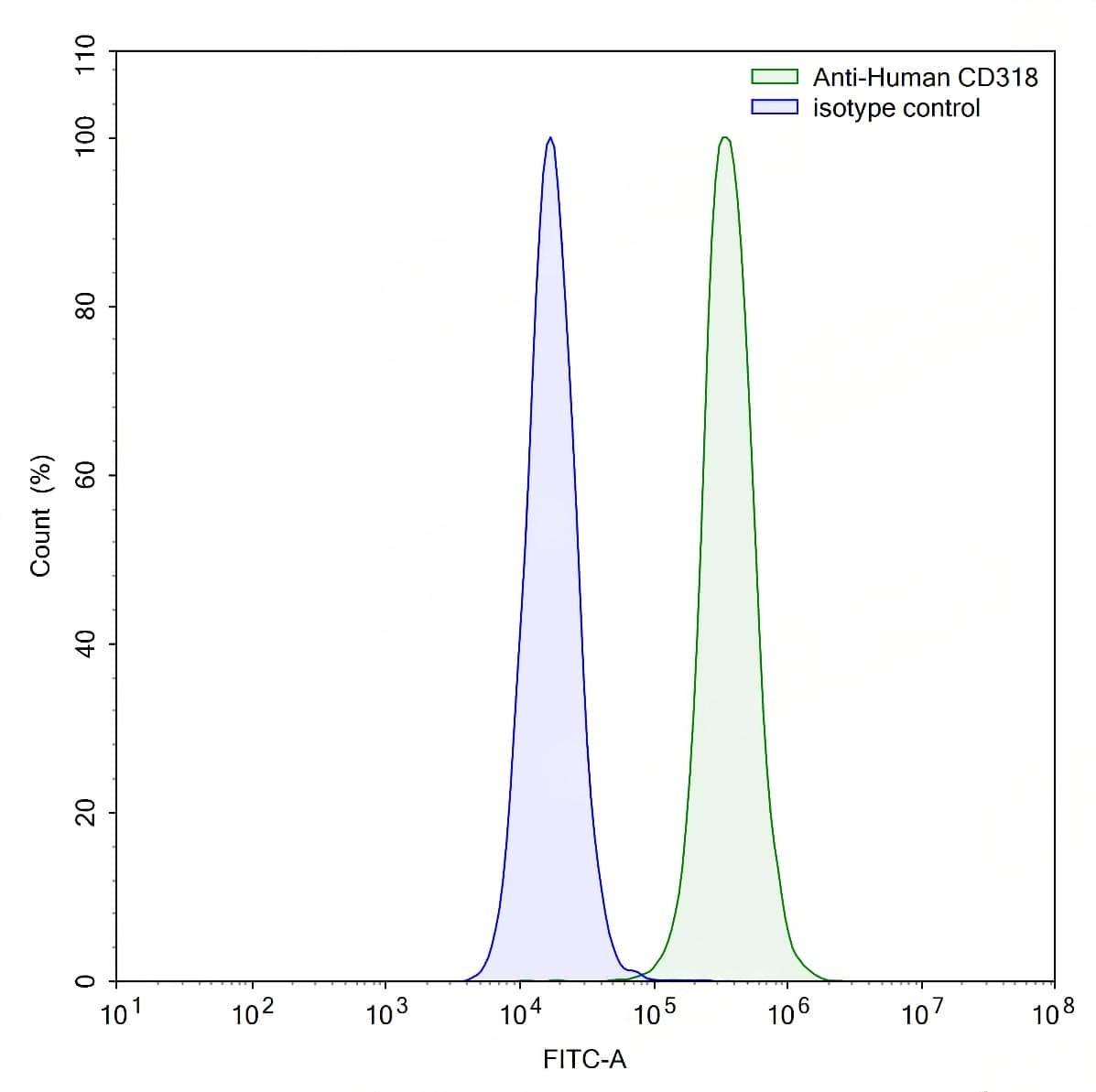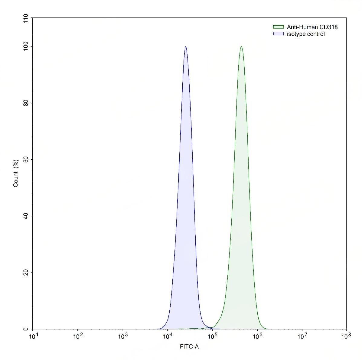Detects Human CD318/CDCP1 in indirect ELISAs. | Flow-cytometry using anti-human CD318 antibody.HT-29 cells were stained with an irrelevant antibody (Blue Histogram) or an anti-human CD318 antibody monoclonal antibody (Catalog No.:TD-HV451107 ,Green Histogram) at a concentration of 5 µg/ml for 30 mins at RT. After washing, bound antibody was detected using a FITC conjugated goat anti-mouse antibody (Catalog No.:TD-MF690414) and cells analysed on a NovoCyte Flow Cytometer. | Flow-cytometry using anti-human CD318 antibody.SW480 cells were stained with an irrelevant antibody (Blue Histogram) or an anti-human CD318 antibody monoclonal antibody (Catalog No.:TD-HV451107 ,Green Histogram) at a concentration of 5 µg/ml for 30 mins at RT. After washing, bound antibody was detected using a FITC conjugated goat anti-mouse antibody (Catalog No.:TD-MF690414) and cells analysed on a NovoCyte Flow Cytometer.