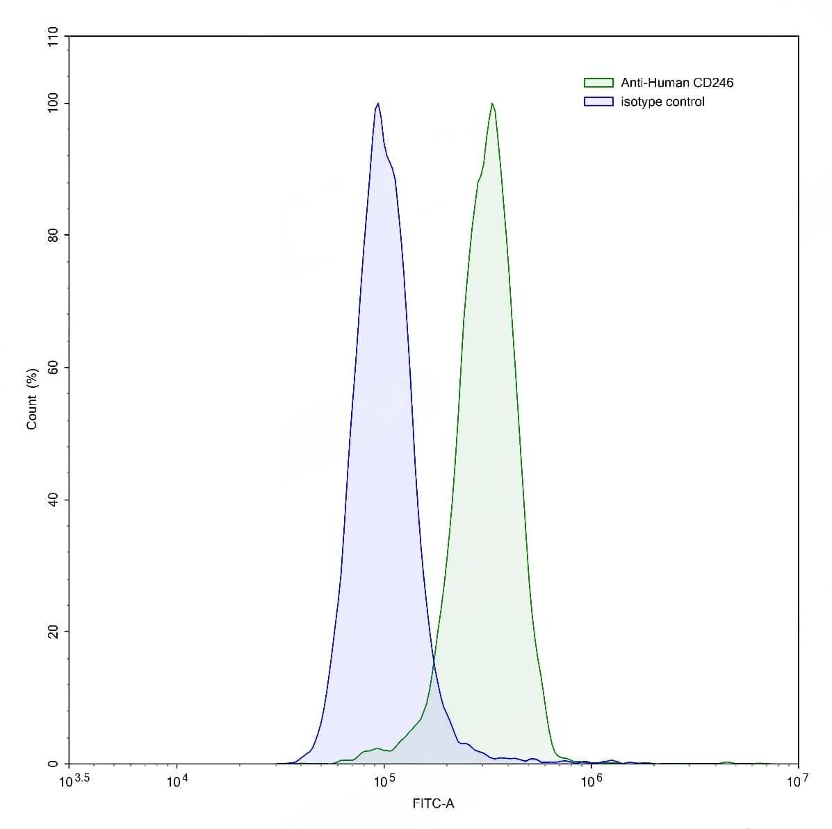 Flow-cytometry using anti-human CD246 antibody.CD246 Transfected HI5 cells were stained with an irrelevant antibody (Blue Histogram) or an anti-human CD246 antibody monoclonal antibody (Catalog No.:TD-HV427107 ,Green Histogram) at a concentration of 5 µg/ml for 30 mins at RT. After washing, bound antibody was detected using a FITC conjugated goat anti-mouse antibody (Catalog No.:TD-MF690414) and cells analysed on a NovoCyte Flow Cytometer.
