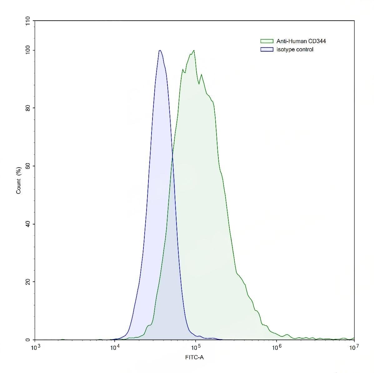Detects CD344/FZD4 in indirect ELISAs. | Flow-cytometry using anti-human CD344 antibody.HeLa cells were stained with an irrelevant antibody (Blue Histogram) or an anti-human CD344 antibody monoclonal antibody (Catalog No.:TD-HV376107 ,Green Histogram) at a concentration of 5 µg/ml for 30 mins at RT. After washing, bound antibody was detected using a FITC conjugated goat anti-mouse antibody (Catalog No.:TD-MF690414) and cells analysed on a NovoCyte Flow Cytometer.