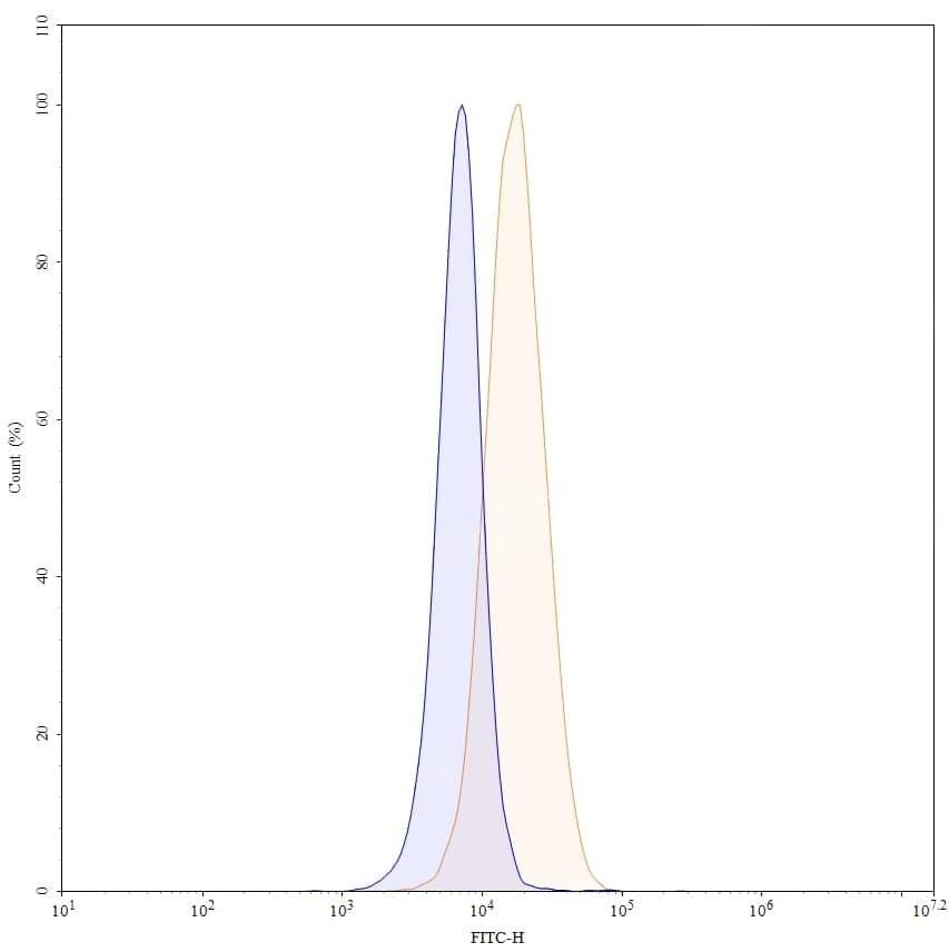 Flow-cytometry using FITC anti-human CD93 antibody. U937 cells were stained with an irrelevant antibody (Blue Histogram) or an FITC anti-human CD93 monoclonal antibody (Catalog No.:TD-HV345217, Yellow Histogram) at a concentration of 5 µg/ml for 30 mins at RT. After washing, and cells analysed on a NovoCyte Flow Cytometer.