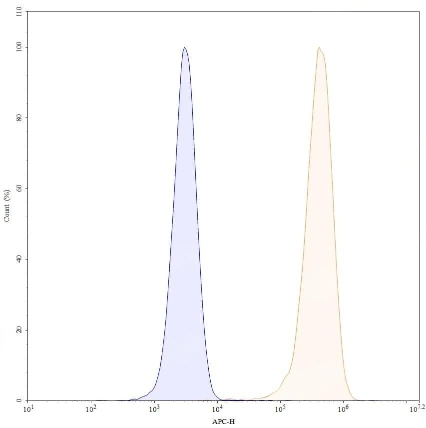 Flow-cytometry using APC anti-human CD93 antibody. U937 cells were stained with an irrelevant antibody (Blue Histogram) or an APC anti-human CD93 monoclonal antibody (Catalog No.:TD-HV345137, Yellow Histogram) at a concentration of 5 µg/ml for 30 mins at RT. After washing, cells analysed on a NovoCyte Flow Cytometer.