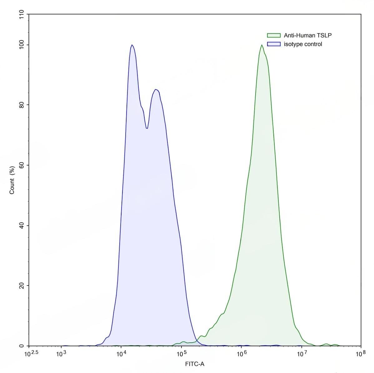 Flow-cytometry using anti-human TSLP antibody.TSLP Transfected CHO cells were stained with an irrelevant antibody (Blue Histogram) or an anti-human TSLP antibody monoclonal antibody (Catalog No.:TD-HV243107 ,Green Histogram) at a concentration of 5 µg/ml for 30 mins at RT. After washing, bound antibody was detected using a FITC conjugated goat anti-human antibody (Catalog No.:TD-HF690414) and cells analysed on a NovoCyte Flow Cytometer.