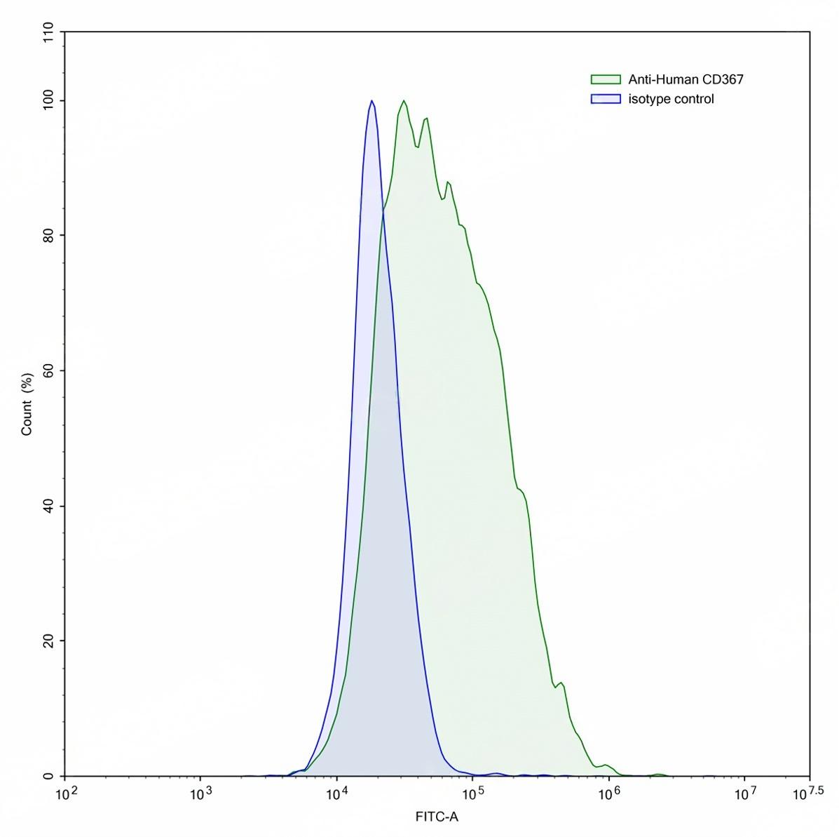Flow-cytometry using anti-human CD367 antibody.CD367 Transfected CHO cells were stained with an irrelevant antibody (Blue Histogram) or an anti-human CD367 antibody monoclonal antibody (Catalog # TD-HV145107 ,Green Histogram) at a concentration of 5 µg/ml for 30 mins at RT. After washing, bound antibody was detected using a FITC conjugated goat anti-mouse antibody (Catalog # TD-MF690414) and cells analysed on a NovoCyte Flow Cytometer.
