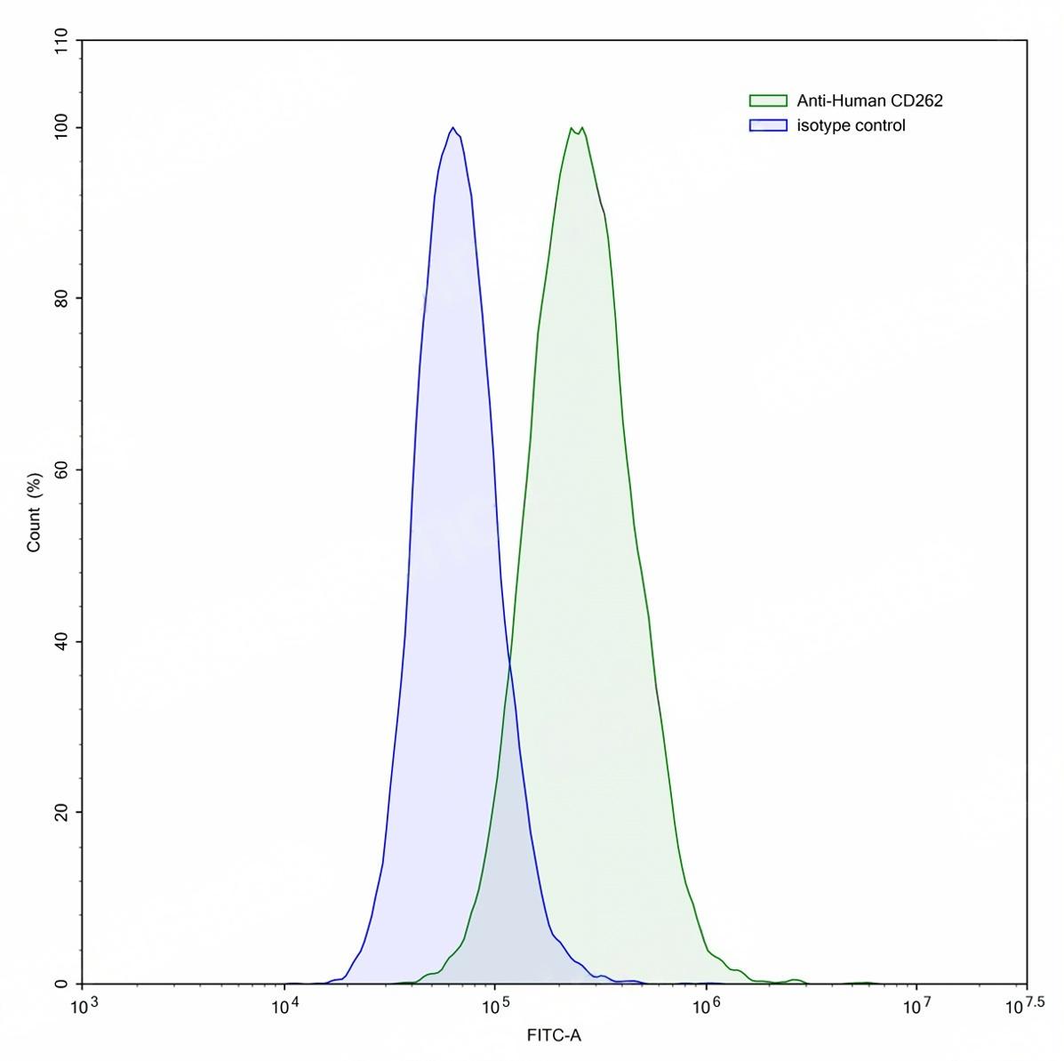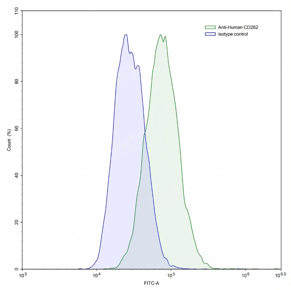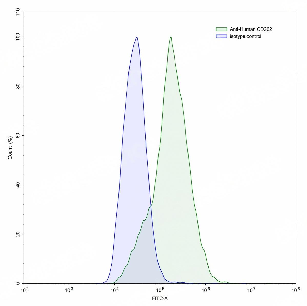 Flow-cytometry using anti-human CD262 antibody.HUVEC cells were stained with an irrelevant antibody (Blue Histogram) or an anti-human CD262 antibody monoclonal antibody (Catalog # TD-HT348307 ,Green Histogram) at a concentration of 5 ug/ml for 30 mins at RT. After washing, bound antibody was detected using a FITC conjugated goat anti-mouse antibody (Catalog # TD-MF690414) and cells analysed on a NovoCyte Flow Cytometer.