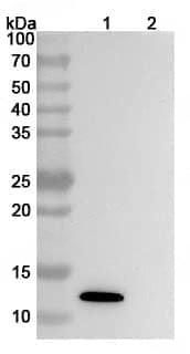 Western blot analysis was performed using anti-CXCL13/BCA-1/BLC monoclonal antibody at 1ug/mL on various samples.Lane 1:recombinant human CXCL13/BCA-1/BLC (Catalog No.:TD-HT294012)Lane 2:negative control | Detects recombinant human CXCL13/BCA-1/BLC (Catalog No.:TD-HT294012) in indirect ELISA