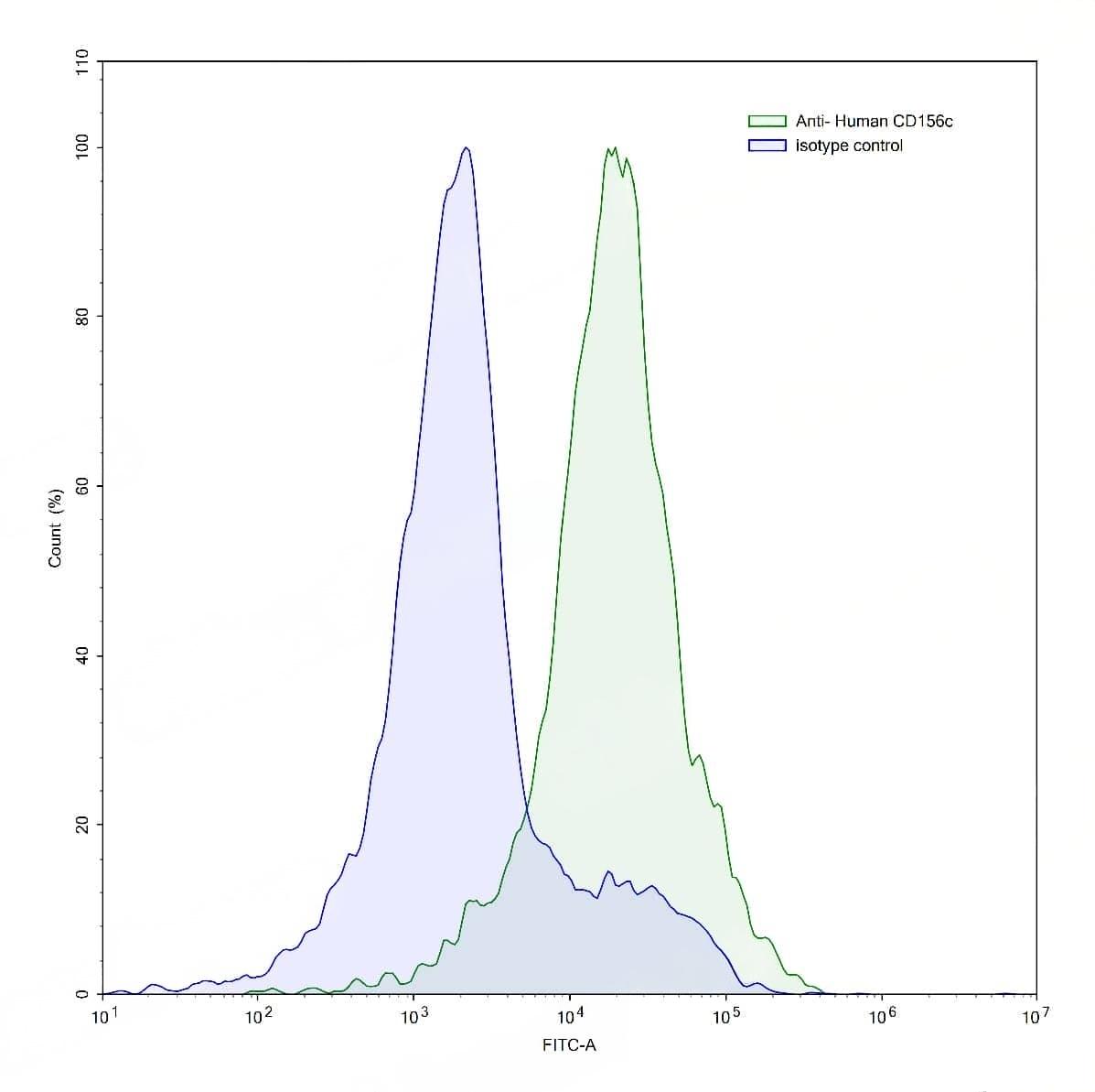 Flow-cytometry using anti-human CD156c antibody.MCF7 cells were stained with an irrelevant antibody (Blue Histogram) or an anti-human CD156c antibody monoclonal antibody (Catalog No.:TD-HT182107 ,Green Histogram) at a concentration of 5 ug/ml for 30 mins at RT. After washing, bound antibody was detected using a FITC conjugated goat anti-mouse antibody (Catalog No.:TD-MF690414) and cells analysed on a NovoCyte Flow Cytometer. | Flow-cytometry using anti-human CD156c antibody.THP-1 cells were stained with an irrelevant antibody (Blue Histogram) or an anti-human CD156c antibody monoclonal antibody (Catalog No.:TD-HT182107 ,Green Histogram) at a concentration of 5 ug/ml for 30 mins at RT. After washing, bound antibody was detected using a FITC conjugated goat anti-mouse antibody (Catalog No.:TD-MF690414) and cells analysed on a NovoCyte Flow Cytometer. | Flow-cytometry using anti-human CD156c antibody.Human peripheral blood lymphocytes were stained with an irrelevant antibody (Blue Histogram) or an anti-human CD156c antibody monoclonal antibody (Catalog No.:TD-HT182107 ,Green Histogram) at a concentration of 5 ug/ml for 30 mins at RT. After washing, bound antibody was detected using a FITC conjugated goat anti-mouse antibody (Catalog No.:TD-MF690414) and cells analysed on a NovoCyte Flow Cytometer. | Flow-cytometry using anti-human CD156c antibody.Human peripheral blood lymphocytes were stained with an irrelevant antibody (Blue Histogram) or an anti-human CD156c antibody monoclonal antibody (Catalog No.:TD-HT182107 ,Green Histogram) at a concentration of 5 ug/ml for 30 mins at RT. After washing, bound antibody was detected using a FITC conjugated goat anti-mouse antibody (Catalog No.:TD-MF690414) and cells analysed on a NovoCyte Flow Cytometer. | Western blot analysis was performed using anti-CD156c/ADAM10 monoclonal antibody at 1μg/ml on various samples.Lane 1:recombinant human CD156c/ADAM10 (Catalog No.:TD-HT182012), 50ngLane 2:recombinant human CD156c/ADAM10 (Catalog No.:TD-HT182012), 30ng