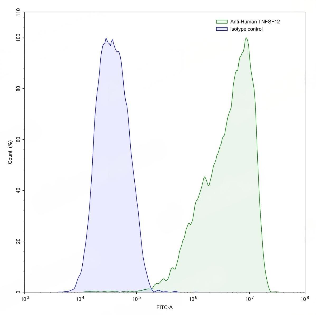 Flow-cytometry using anti-human TNFSF12 antibody.TNFSF12 Transfected CHO cells were stained with an irrelevant antibody (Blue Histogram) or an anti-human TNFSF12 antibody monoclonal antibody (Catalog No.:TD-HT065107 ,Green Histogram) at a concentration of 5 ug/ml for 30 mins at RT. After washing, bound antibody was detected using a FITC conjugated goat anti-mouse antibody (Catalog No.:TD-MF690414) and cells analysed on a NovoCyte Flow Cytometer. | Detects Recombinant Human TNFSF12/APO3L/TWEAK Protein, C-His (Cat No.:TD-HT065011) in indirect ELISA.