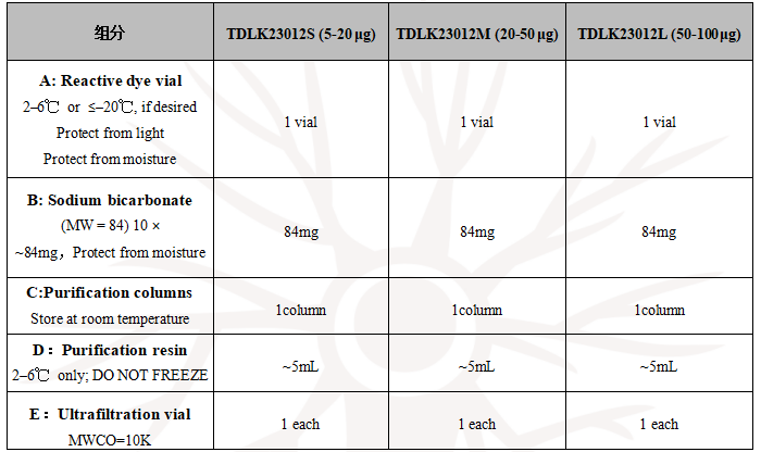 Tanda® 标记试剂盒适合标记 IgG等蛋白。如果标记其他非IgG蛋白质,可能标记的 DOL(degree of labeling)要根据不同蛋白来计算所需染料量。Tanda® 标记试剂盒可能导致 IgM抗体变性。