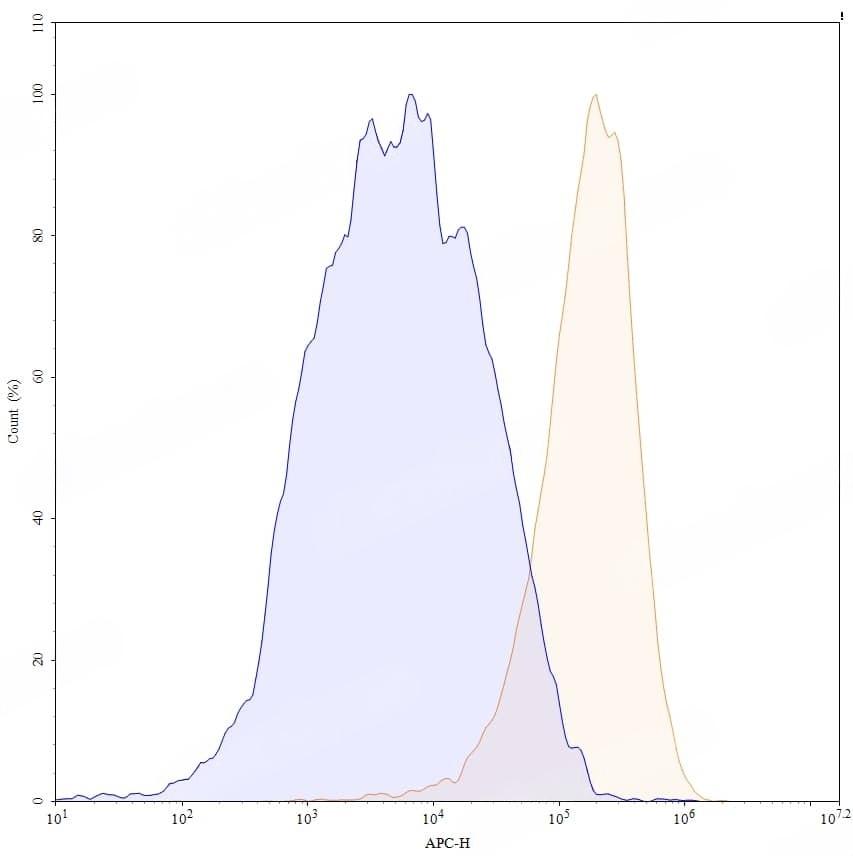 Flow-cytometry APC using anti-human MICA antibody. Untransfected cells (blue Histogram) and Transfected cells (Yellow Histogram) were stained with an APC anti-human MICA monoclonal antibody (Catalog No.:TD-HS894137) at a concentration of 5 µg/ml for 30 mins at RT. After washing, cells analysed on a NovoCyte Flow Cytometer.