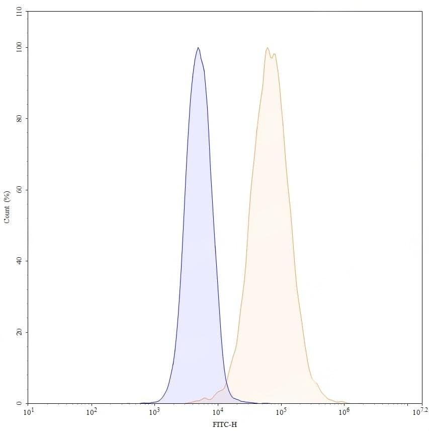 Flow-cytometry FITC using anti-human MICA antibody. Untransfected cells (blue Histogram) and Transfected cells (Yellow Histogram) were stained with an FITC anti-human MICA monoclonal antibody (Catalog No.:TD-HS894117) at a concentration of 5 µg/ml for 30 mins at RT. After washing, cells analysed on a NovoCyte Flow Cytometer. | Flow-cytometry FITC using anti-human MICB antibody. Untransfected cells (blue Histogram) and Transfected cells (Yellow Histogram) were stained with an FITC anti-human MICB monoclonal antibody (Catalog No.:TD-HS894117) at a concentration of 5 µg/ml for 30 mins at RT. After washing, cells analysed on a NovoCyte Flow Cytometer.