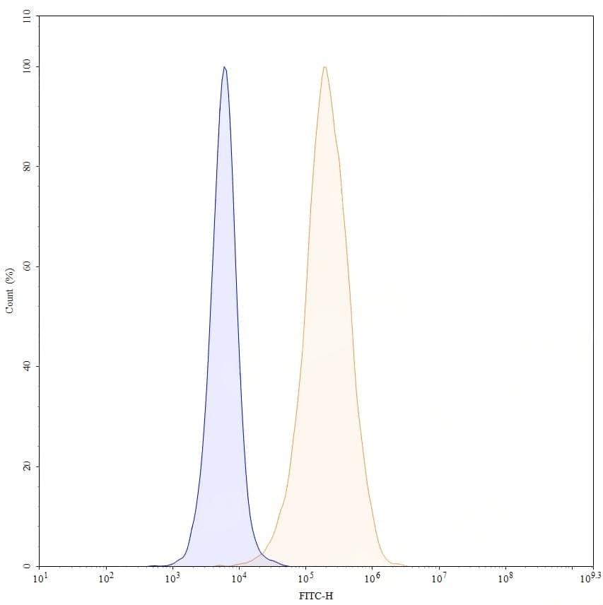SEC-HPLC detection for Anti-Human MICA Antibody (16A8). | Flow-cytometry using anti-human MICA antibody. Untransfected cells (blue Histogram) and Transfected cells (Yellow Histogram) were stained with an anti-human MICA monoclonal antibody (Catalog No.:TD-HS894107) at a concentration of 5 µg/ml for 30 mins at RT. After washing, bound antibody was detected using a Goat Anti-Human IgG H&L Polyclonal Antibody, FITC (Catalog No.:TD-HF690414) and cells analysed on a NovoCyte Flow Cytometer.