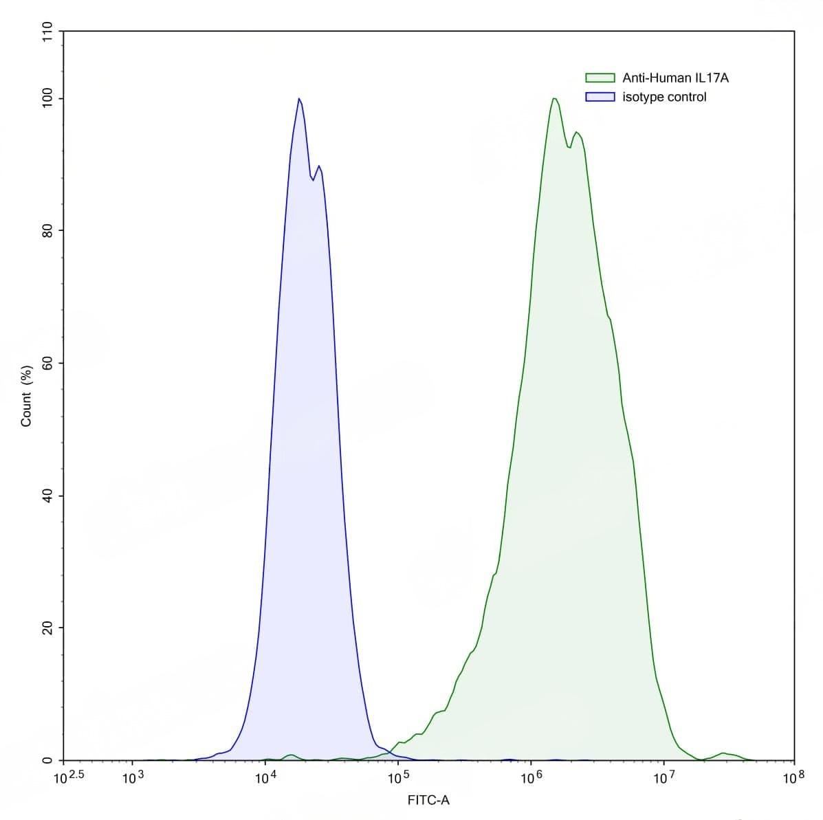 Flow-cytometry using anti-human IL17A antibody.IL17A Transfected CHO cells were stained with an irrelevant antibody (Blue Histogram) or an anti-human IL17A antibody monoclonal antibody (Catalog No.:TD-HS856207 ,Green Histogram) at a concentration of 5 µg/ml for 30 mins at RT. After washing, bound antibody was detected using a FITC conjugated goat anti-human antibody (Catalog No.:TD-HF690414) and cells analysed on a NovoCyte Flow Cytometer. | Flow-cytometry using anti-human IL17A antibody.Human Jurkat cell line were stained with an irrelevant antibody (Blue Histogram) or an anti-human IL17A antibody monoclonal antibody (Catalog No.:TD-HS856207 ,Green Histogram) at a concentration of 5 µg/ml for 30 mins at RT. After washing, bound antibody was detected using a FITC conjugated goat anti-human antibody (Catalog No.:TD-HF690414) and cells analysed on a NovoCyte Flow Cytometer.