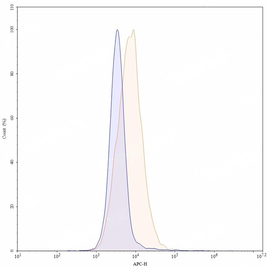 Flow-cytometry using APC anti-human CA9 antibody. U87 cells were stained with an irrelevant antibody (Blue Histogram) or an APC anti-human CA9 monoclonal antibody (Catalog: TD-HS840137, Yellow Histogram) at a concentration of 5 µg/ml for 30 mins at RT. After washing, and cells analysed on a NovoCyte Flow Cytometer.