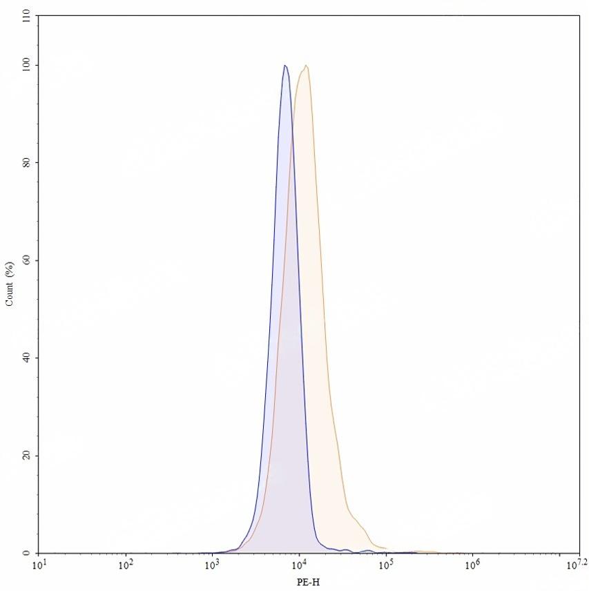 Flow-cytometry using PE anti-human CA9 antibody. U87 cells were stained with an irrelevant antibody (Blue Histogram) or an PE anti-human CA9 monoclonal antibody (Catalog: TD-HS840127, Yellow Histogram) at a concentration of 5 µg/ml for 30 mins at RT. After washing, and cells analysed on a NovoCyte Flow Cytometer.