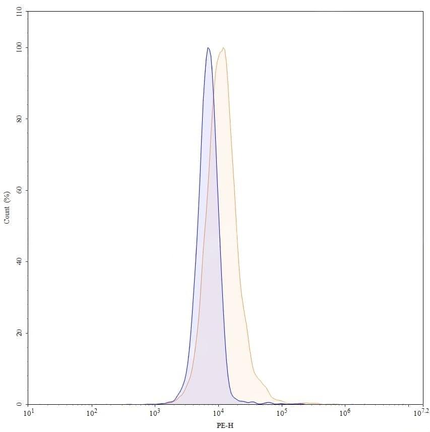 Flow-cytometry using PE anti-human CA9 antibody. U87 cells were stained with an irrelevant antibody (Blue Histogram) or an PE anti-human CA9 monoclonal antibody (Catalog No.:TD-HS840127, Yellow Histogram) at a concentration of 5 µg/ml for 30 mins at RT. After washing, and cells analysed on a NovoCyte Flow Cytometer.