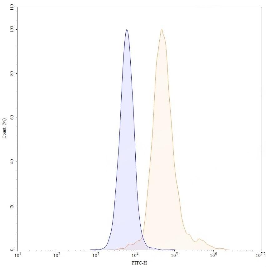 Flow-cytometry FITC using anti-human TIGIT antibody. Untransfected cells (blue Histogram) and Transfected cells (Yellow Histogram) were stained with an FITC anti-human TIGIT monoclonal antibody (Catalog No.:TD-HS739317) at a concentration of 5 µg/ml for 30 mins at RT. After washing, cells analysed on a NovoCyte Flow Cytometer.