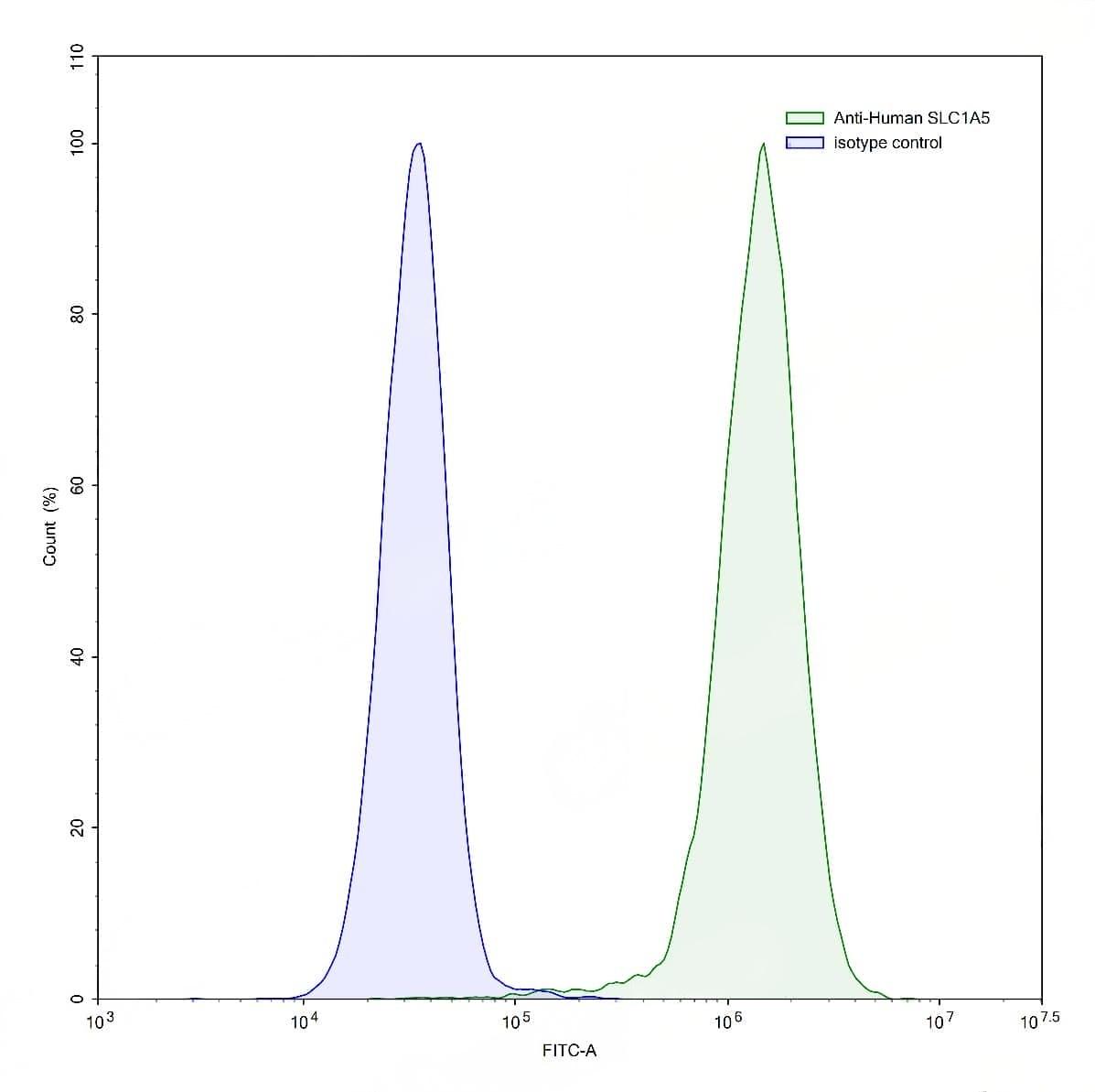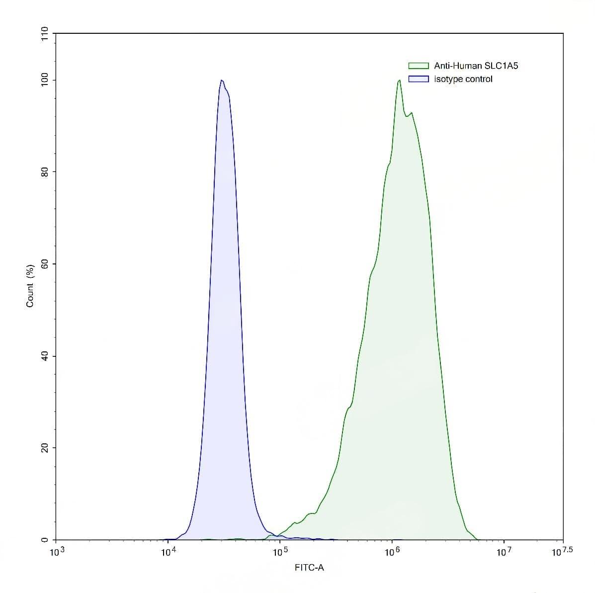 Flow-cytometry using anti-human SLC1A5 antibody.HeLa cells were stained with an irrelevant antibody (Blue Histogram) or an anti-human SLC1A5 antibody monoclonal antibody (Catalog No.:TD-HS734107 ,Green Histogram) at a concentration of 5 µg/ml for 30 mins at RT. After washing, bound antibody was detected using a FITC conjugated goat anti-human antibody (Catalog No.:TD-HF690414) and cells analysed on a NovoCyte Flow Cytometer. | Flow-cytometry using anti-human SLC1A5 antibody.A431 cells were stained with an irrelevant antibody (Blue Histogram) or an anti-human SLC1A5 antibody monoclonal antibody (Catalog No.:TD-HS734107 ,Green Histogram) at a concentration of 5 µg/ml for 30 mins at RT. After washing, bound antibody was detected using a FITC conjugated goat anti-human antibody (Catalog No.:TD-HF690414) and cells analysed on a NovoCyte Flow Cytometer.