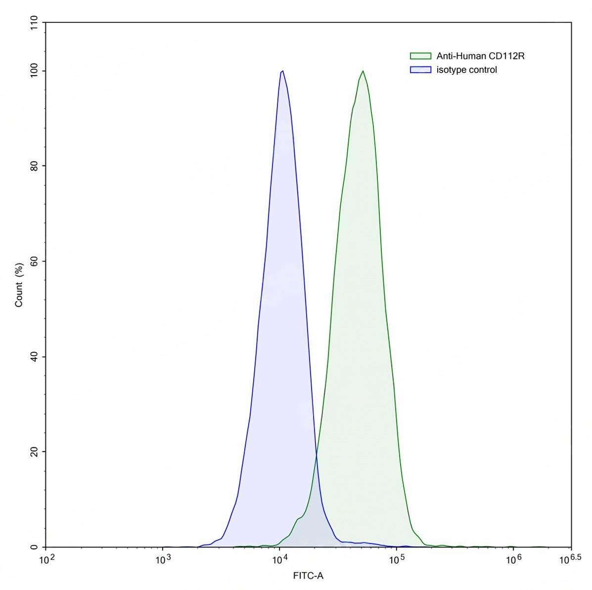 Flow-cytometry using anti-human CD112R antibody.Jurkat cells were stained with an irrelevant antibody (Blue Histogram) or an anti-human CD112R antibody monoclonal antibody (Catalog # TD-HP700107 ,Green Histogram) at a concentration of 5 µg/ml for 30 mins at RT. After washing, bound antibody was detected using a FITC conjugated goat anti-mouse antibody (Catalog # TD-MF690414) and cells analysed on a NovoCyte Flow Cytometer.
