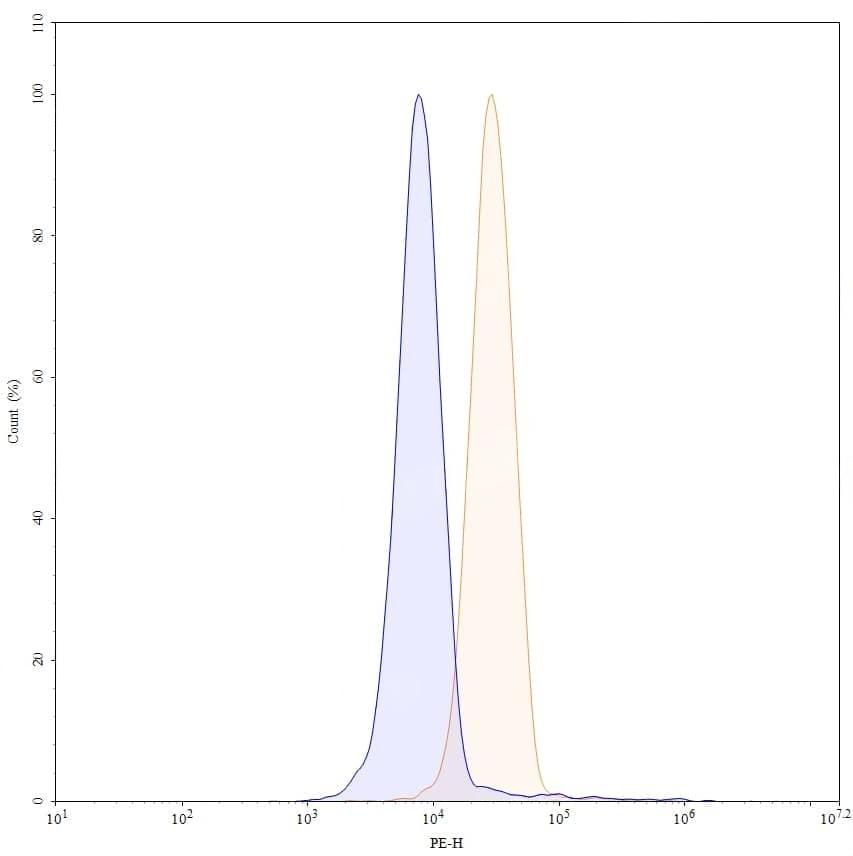 Flow-cytometry using PE anti-human SIGLEC15 antibody. U87 cells were stained with an irrelevant antibody (Blue Histogram) or an PE anti-human SIGLEC15 monoclonal antibody (Catalog No.:TD-HP516127, Yellow Histogram) at a concentration of 5 µg/ml for 30 mins at RT. After washing, cells analysed on a NovoCyte Flow Cytometer.