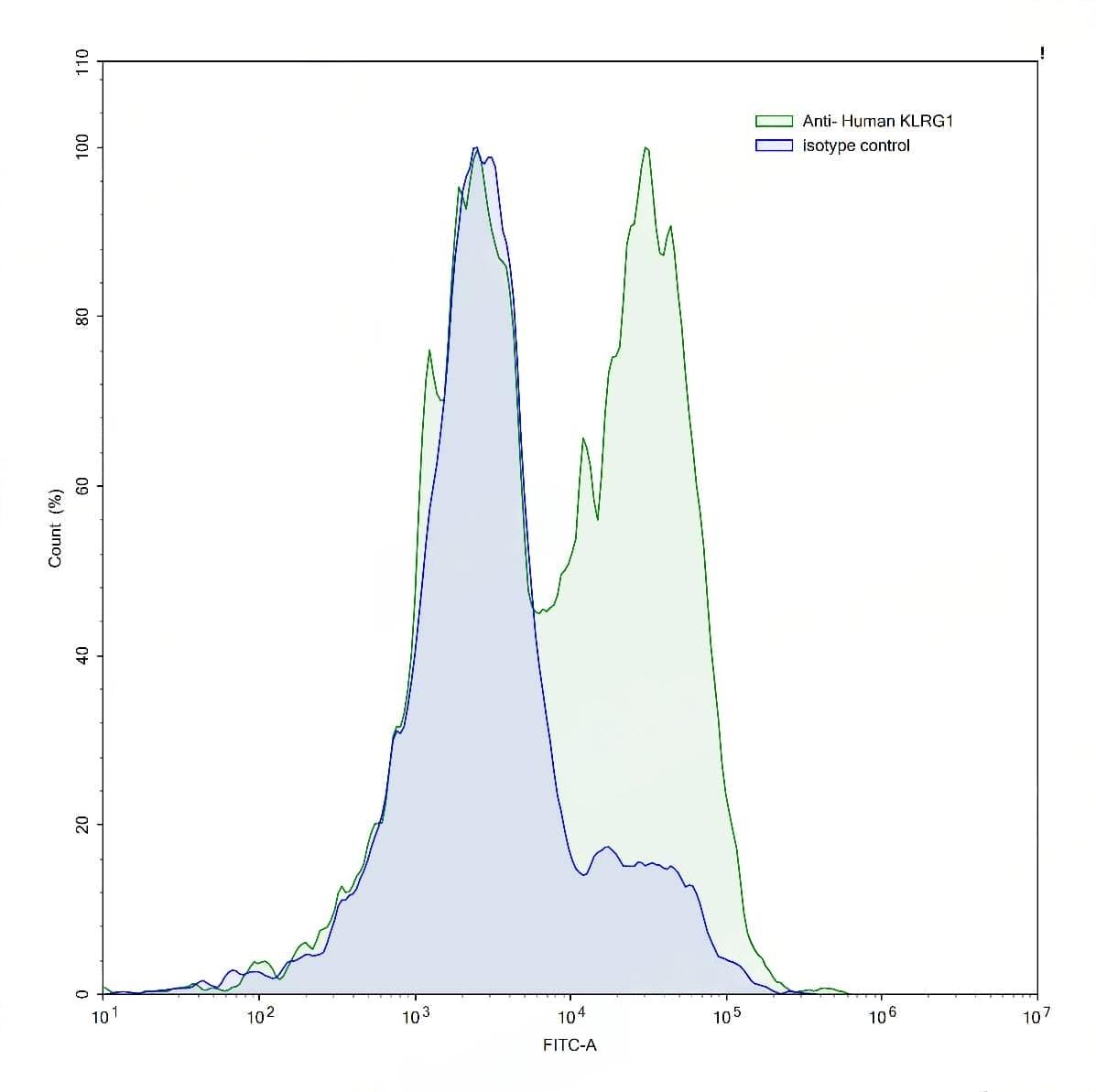 SDS-PAGE for Anti-Human KLRG1/CLEC15A Antibody (SAA0508) | Flow-cytometry using anti-human KLRG1 antibody.Human peripheral blood lymphocytes were stained with an irrelevant antibody (Blue Histogram) or an anti-human KLRG1 antibody monoclonal antibody (Catalog No.:TD-HP013107 ,Green Histogram) at a concentration of 5 µg/ml for 30 mins at RT. After washing, bound antibody was detected using a FITC conjugated goat anti-mouse antibody (Catalog No.:TD-MF690414) and cells analysed on a NovoCyte Flow Cytometer.
