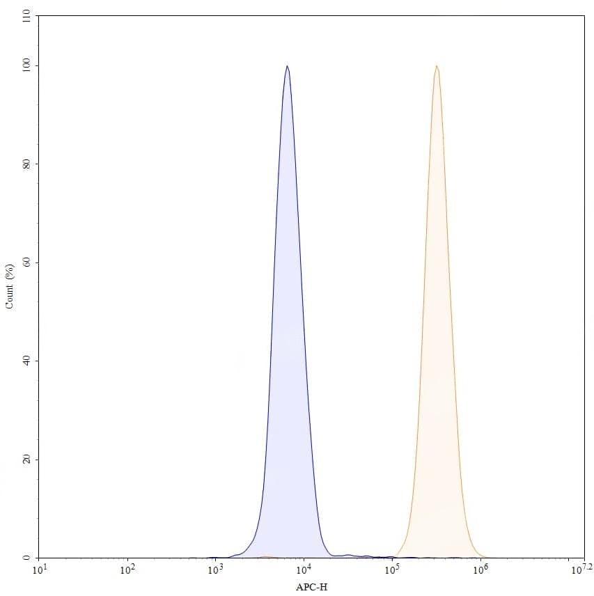Flow-cytometry using APC anti-human HLA-A,B,C Monomorphic antibody. A431 cells were stained with an irrelevant antibody (Blue Histogram) or an APC anti-human HLA-A,B,C Monomorphic monoclonal antibody (Catalog No.:TD-HM834137, Yellow Histogram) at a concentration of 5 µg/ml for 30 mins at RT. After washing, and cells analysed on a NovoCyte Flow Cytometer.