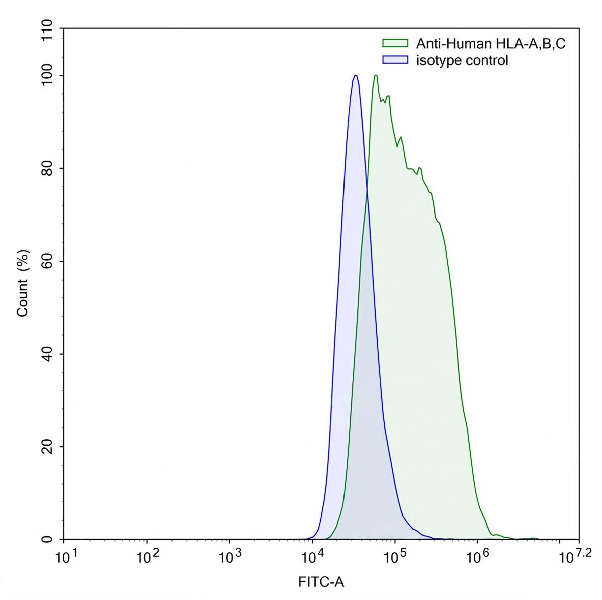 Flow-cytometry using anti-human HLA-A,B,C antibody.Human peripheral blood lymphocytes were stained with an irrelevant antibody (Blue Histogram) or an anti-human HLA-A,B,C antibody monoclonal antibody (Catalog # TD-HM834107 ,Green Histogram) at a concentration of 5 µg/ml for 30 mins at RT. After washing, bound antibody was detected using a FITC conjugated goat anti-mouse antibody (Catalog # TD-MF690414) and cells analysed on a NovoCyte Flow Cytometer.
