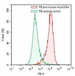 Flow-cytometry using PE anti-human HLA-DRA antibody. Daudi cells were stained with an irrelevant antibody (Green Histogram) or a PE anti-human HLA-DRA antibody monoclonal antibody (Catalog # TD-HM826127, Red Histogram) at a concentration of 5 µg/ml for 30 mins at RT. After washing, cells analysed on a NovoCyte Flow Cytometer.