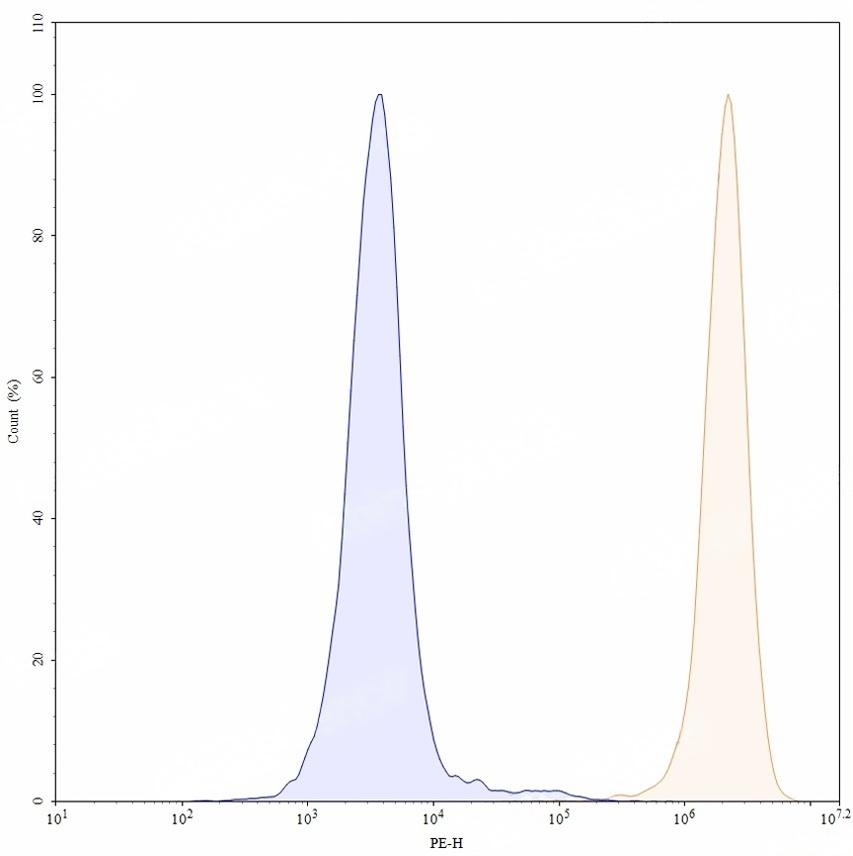 Flow-cytometry using PE anti-human HLA-DR Monomorphic antibody. Daudi cells were stained with an irrelevant antibody (Blue Histogram) or an PE anti-human HLA-DR Monomorphic monoclonal antibody (Catalog: TD-HM826127, Yellow Histogram) at a concentration of 5 µg/ml for 30 mins at RT. After washing, cells analysed on a NovoCyte Flow Cytometer.
