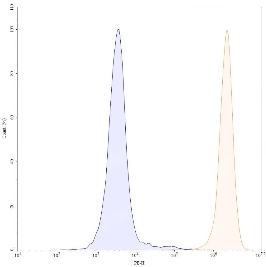 Flow-cytometry using PE anti-human HLA-DRA antibody. Daudi cells were stained with an irrelevant antibody (Green Histogram) or a PE anti-human HLA-DRA antibody monoclonal antibody (Catalog No.:TD-HM826127, Red Histogram) at a concentration of 5 µg/ml for 30 mins at RT. After washing, cells analysed on a NovoCyte Flow Cytometer. | Flow-cytometry using PE anti-human HLA-DR Monomorphic antibody. Daudi cells were stained with an irrelevant antibody (Blue Histogram) or an PE anti-human HLA-DR Monomorphic monoclonal antibody (Catalog No.:TD-HM826127, Yellow Histogram) at a concentration of 5 µg/ml for 30 mins at RT. After washing, cells analysed on a NovoCyte Flow Cytometer.