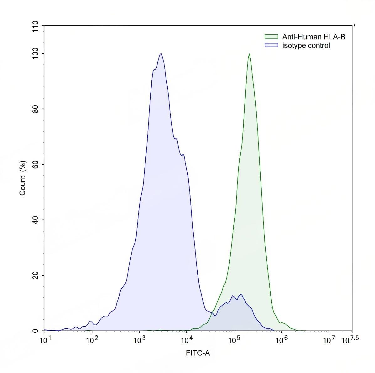 Flow-cytometry using anti-human HLA-B antibody.Human peripheral blood monocytes were stained with an irrelevant antibody (Blue Histogram) or an anti-human HLA-B antibody monoclonal antibody (Catalog No.:TD-HM814107 ,Green Histogram) at a concentration of 5 µg/ml for 30 mins at RT. After washing, bound antibody was detected using a FITC conjugated goat anti-mouse antibody (Catalog No.:TD-MF690414) and cells analysed on a NovoCyte Flow Cytometer. | Flow-cytometry using anti-human HLA-B antibody.Human peripheral blood lymphocytes were stained with an irrelevant antibody (Blue Histogram) or an anti-human HLA-B antibody monoclonal antibody (Catalog No.:TD-HM814107 ,Green Histogram) at a concentration of 5 µg/ml for 30 mins at RT. After washing, bound antibody was detected using a FITC conjugated goat anti-mouse antibody (Catalog No.:TD-MF690414) and cells analysed on a NovoCyte Flow Cytometer.