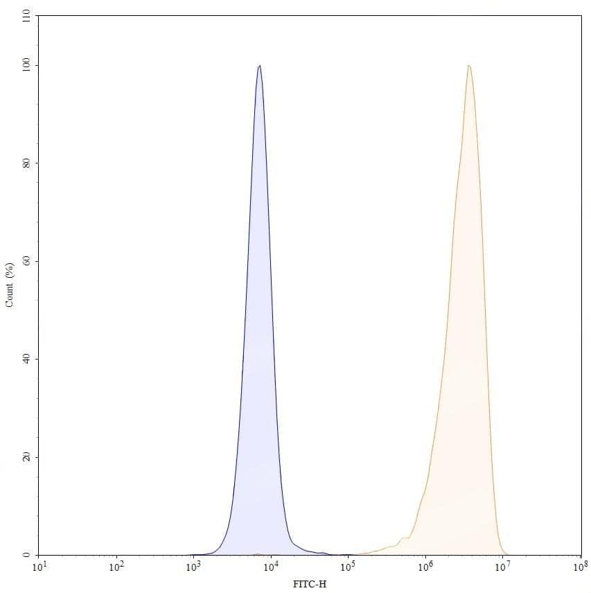 Flow-cytometry using anti-human CD25 antibody. Untransfected cells (blue Histogram) and Transfected cells (Yellow Histogram) were stained with an anti-human CD25 monoclonal antibody (Catalog No.:TD-HF996107) at a concentration of 5 µg/ml for 30 mins at RT. After washing, bound antibody was detected using a Goat Anti-Human IgG H&L Polyclonal Antibody, FITC (Catalog No.:TD-HF690414) and cells analysed on a NovoCyte Flow Cytometer.