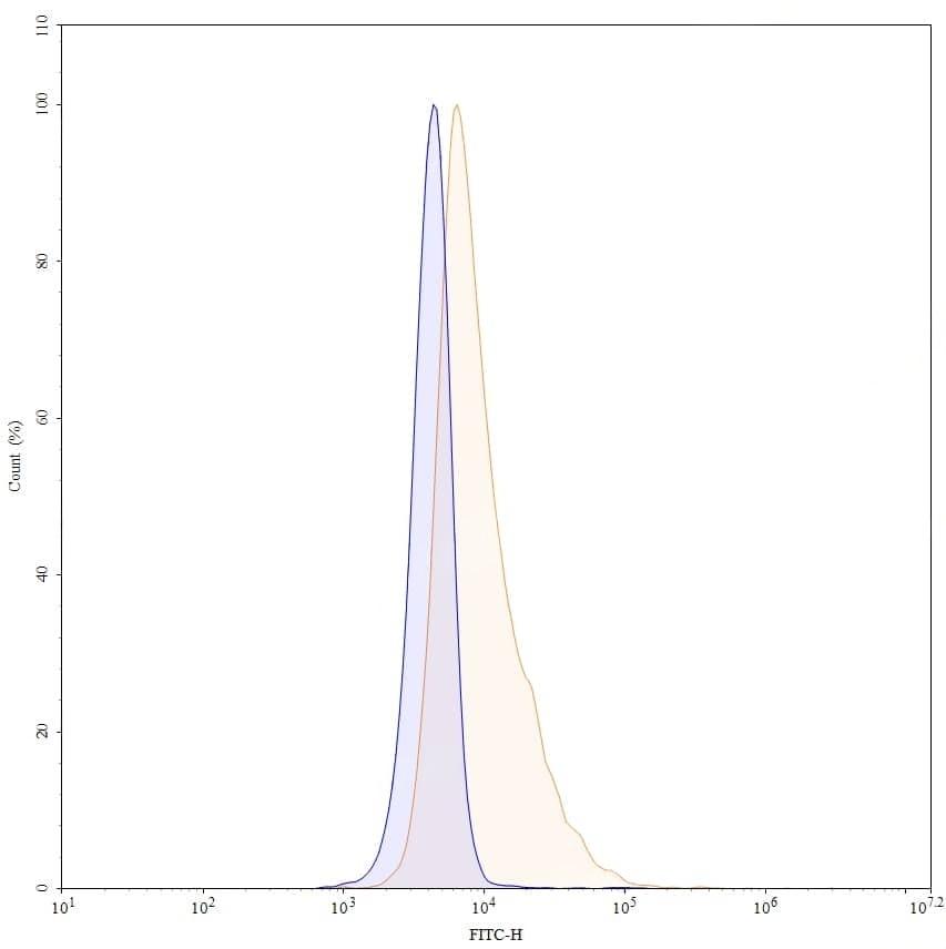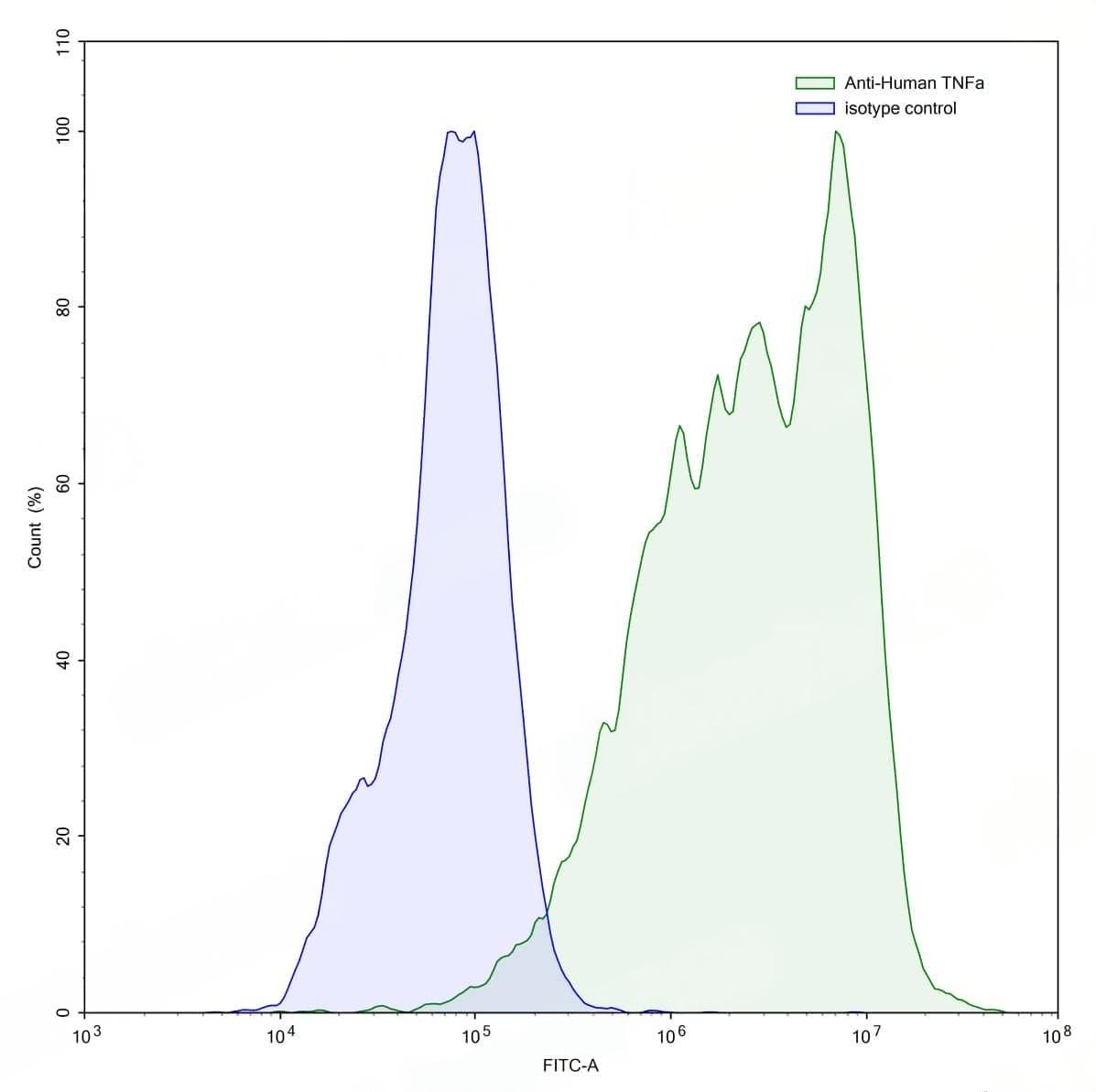 Flow-cytometry using anti-human TNFa antibody.TNFa Transfected CHO cells were stained with an irrelevant antibody (Blue Histogram) or an anti-human TNFa antibody monoclonal antibody (Catalog No.:TD-HF879107 ,Green Histogram) at a concentration of 5 ug/ml for 30 mins at RT. After washing, bound antibody was detected using a FITC conjugated goat anti-mouse antibody (Catalog No.:TD-MF690414) and cells analysed on a NovoCyte Flow Cytometer. | Flow-cytometry using anti-human TNFa antibody.LPS treated THP-1 cells were stained with an irrelevant antibody (Blue Histogram) or an anti-human TNFa antibody monoclonal antibody (Catalog No.:TD-HF879107 ,Green Histogram) at a concentration of 5 ug/ml for 30 mins at RT. After washing, bound antibody was detected using a FITC conjugated goat anti-mouse antibody (Catalog No.:TD-MF690414) and cells analysed on a NovoCyte Flow Cytometer. | Flow-cytometry using anti-human TNFa antibody. 293T transfected cells were stained with an irrelevant antibody (Blue Histogram) or an anti-human TNFa monoclonal antibody (Catalog No.:TD-HF879107, Yellow Histogram) at a concentration of 5 µg/ml for 30 mins at RT. After washing, bound antibody was detected using a Goat Anti-Mouse IgG H&L Polyclonal Antibody, FITC (Catalog No.:TD-MF690414) and cells analysed on a NovoCyte Flow Cytometer.